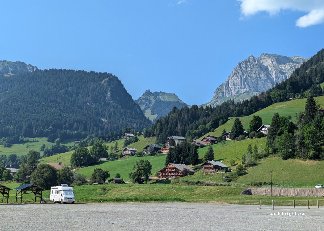 Seulement 2 Camping-Car et quelques voitures de randonneurs, calme. Randos juste derrière et devant vue sur les jolis chalets. Très vaste et gravillonné mais sans ombre. 4G OK.