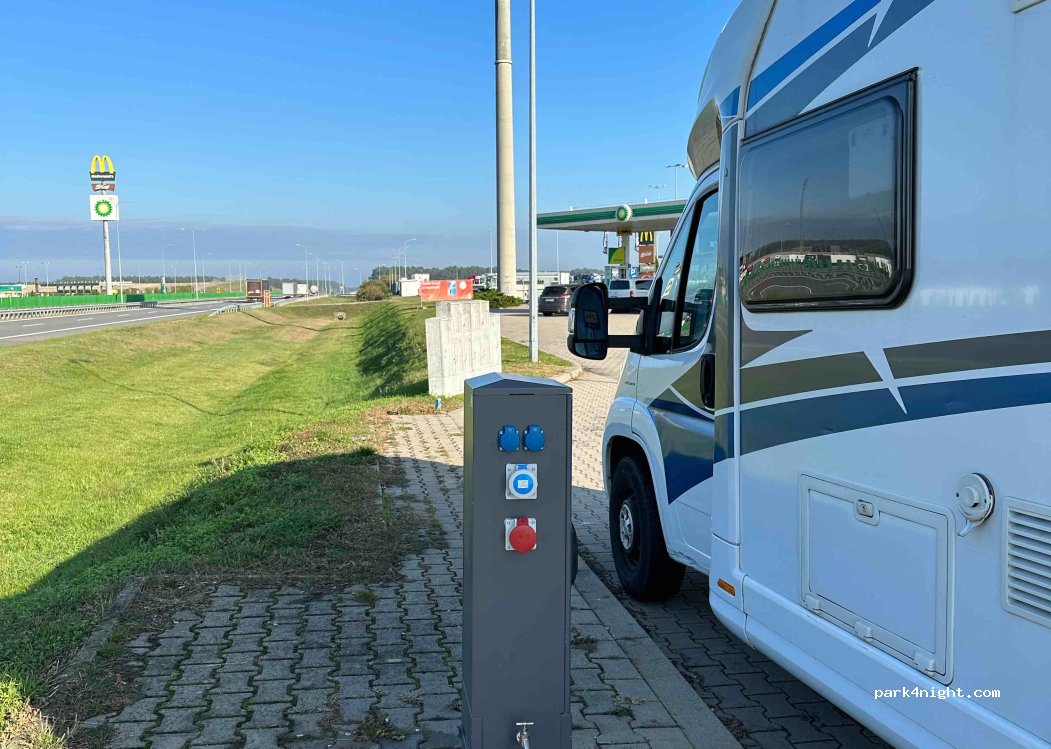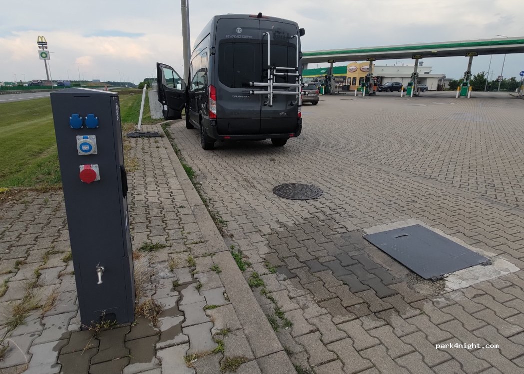 Przed stacja benzynowa jest miejsce w którym można zlać szarą wodę i wylać zawartość kasetki oraz kranik do napełnienia czystej wody.