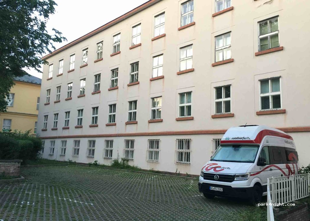 Dieser Platz ist kostenlos und zentrumsnah. Eine Schranke, wie auf Google Street View zu sehen, gibt es schon längere Zeit nicht mehr. Wir sind Sonntag zu 16.00 angekommen und haben einen guten Platz (siehe Foto) bekommen. Am Montag früh ab 6.30 füllte sich der Parkplatz bis auf den letzten Platz. Toiletten gibt es direkt nebenan, in der Stadtverwaltung, zu deren Öffnungszeiten.