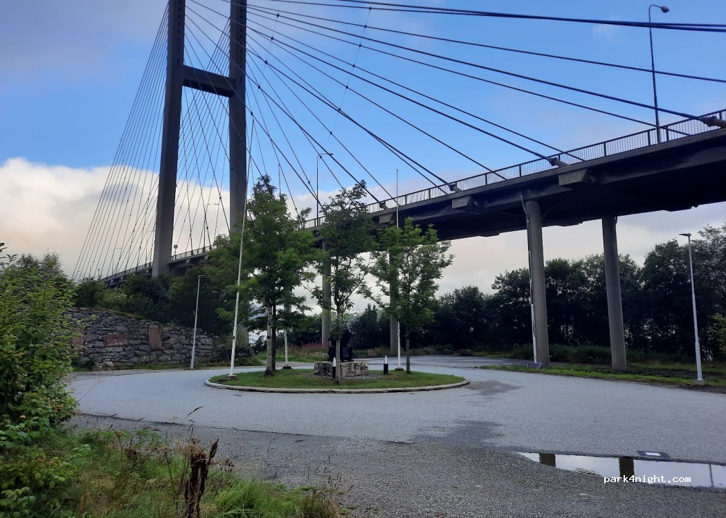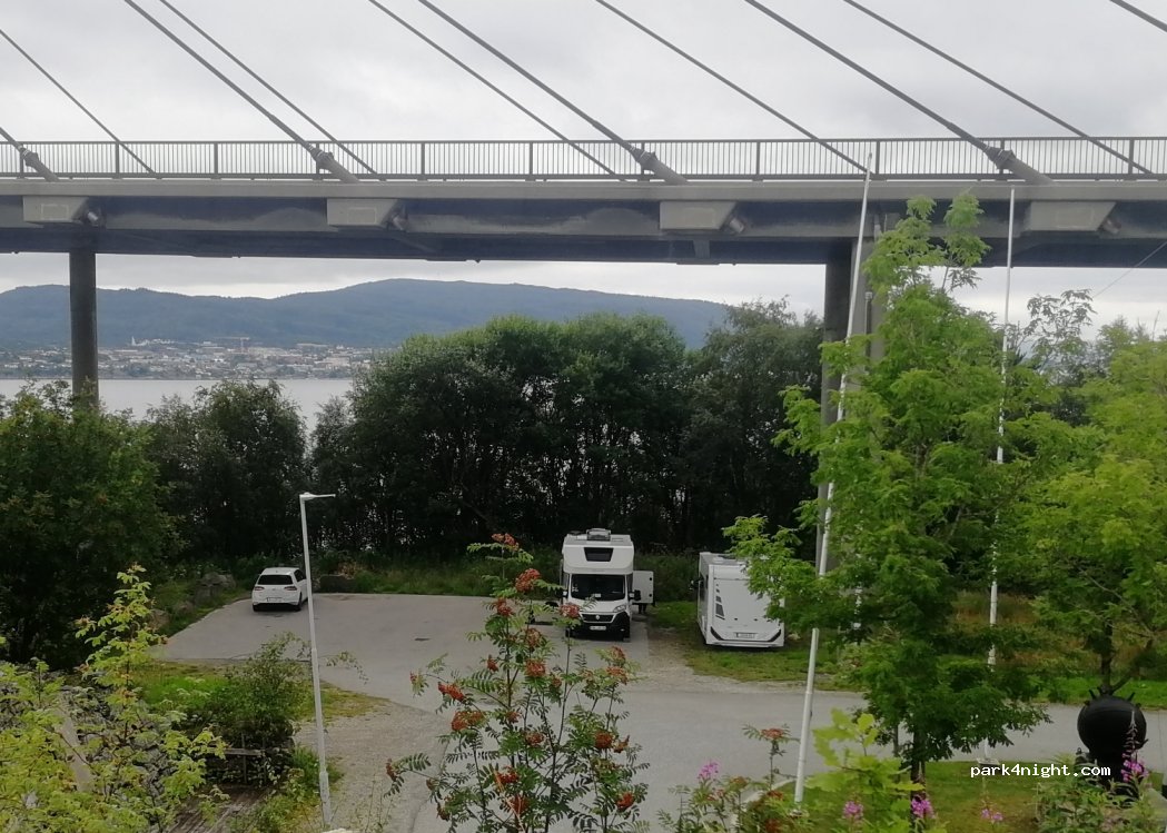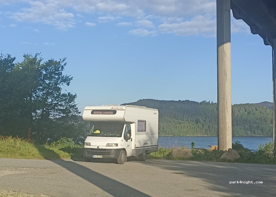 Parking en contrebas du pont, sans services mais spacieux. Sentier pour promener les chiens. Possibilité de pêcher (maquereau, lieu noir) au pied du pont. Un peu bruyant avec la circulation, mais nuit paisible malgré tout. Parfait pour une pause avant Bergen.
