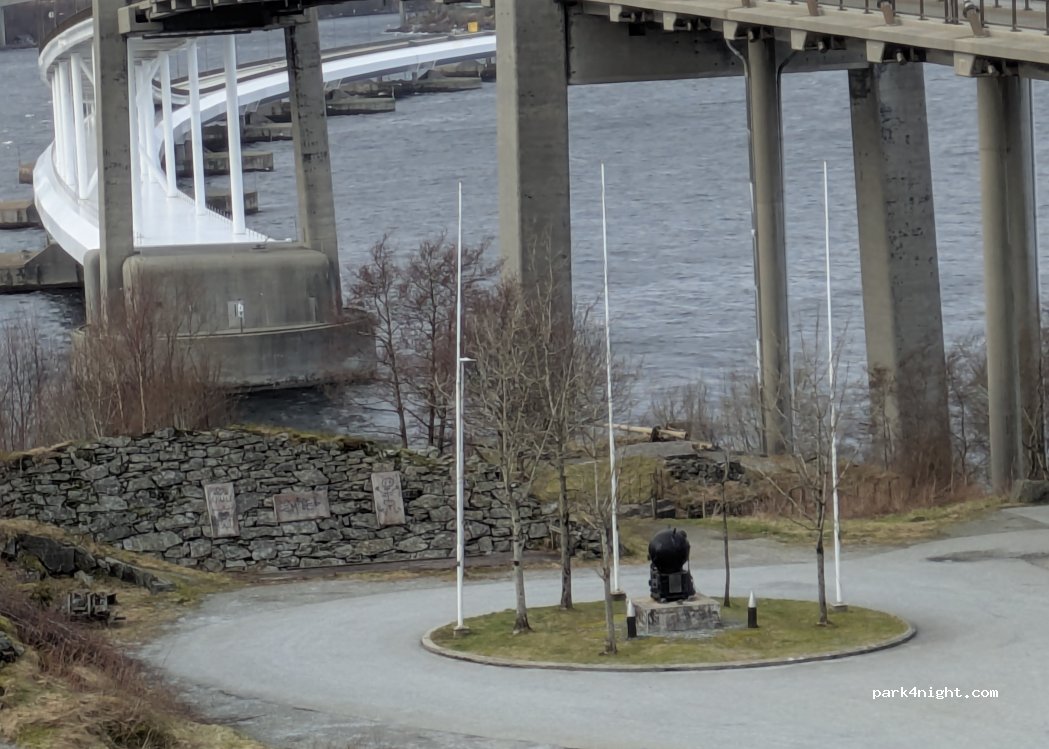 Parcheggio sotto il ponte, vicino ad un memoriale della guerra, ad una mezz’ora dal centro di Bergen. Abbiamo dormito lì una notte per poter visitare la città il giorno dopo. Ovviamente si sentono le macchine che passano sul ponte, ma la notte erano davvero poche, mentre la mattina ce n’erano parecchie, ma abbiamo dormito senza problemi. Non ci sono né servizi, né cestini.