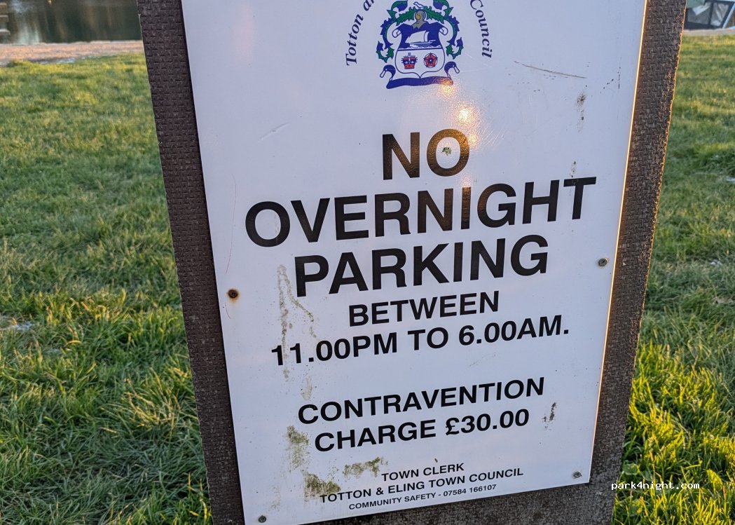Small grassed area. No restriction on the grass but there’s a sign that covers the tarmac area. There’s a pub nearby and the Eling river and goatee beach.