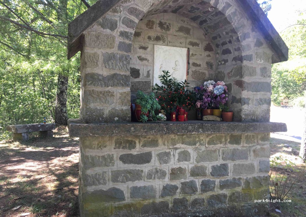 Simple shaded place with stone benches by a Madonna and child little chapel. Good for a quick snack en route to the villages of Garfagnana from Fivizzano. Possible night stop over?