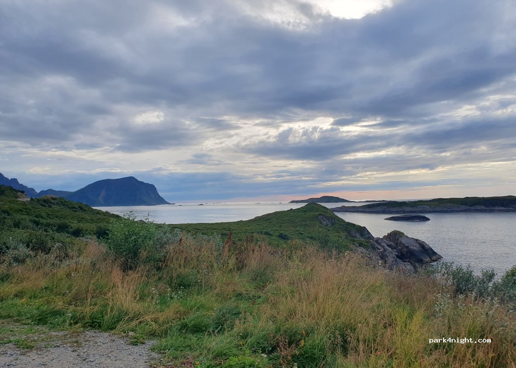 Parking avec une belle vue sur la mer ouverte. Espace de gravier à côté de la route non goudronnée. Relativement plat. Coucher de soleil!