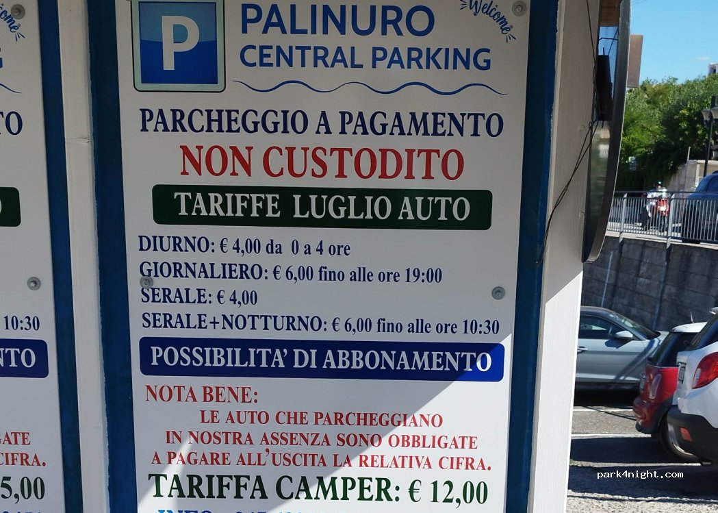 Usufruito a luglio 2025, unico camper presente con il livello inferiore del parcheggio completamente vuoto. Il parcheggio si riempie di sera di macchine che visitano Palinuro, e ci sono locali nei dintorni, forse può essere rumoroso in alta stagione. Non è consentito parcheggiare e non è presente alcun servizio al di fuori dell’illuminazione. 12 euro per 24h. Piazzole panoramicissime.