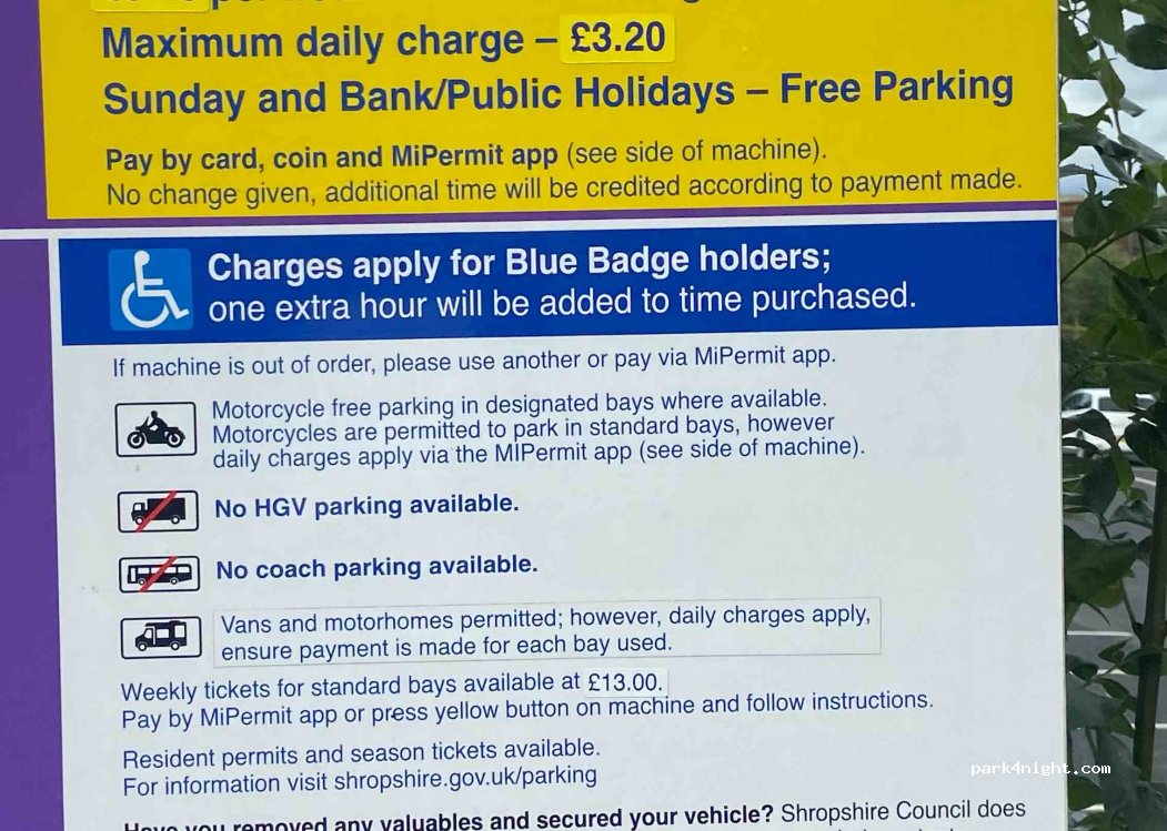 Arrived at 3:30. Paid £1.60. Moved the van to a quieter spot at 6pm. Excellent place to park near the town centre, and a very quiet night. Paid a further £4.20 to park up the rest of the day to explore lovely Ludlow. Definitely recommended.