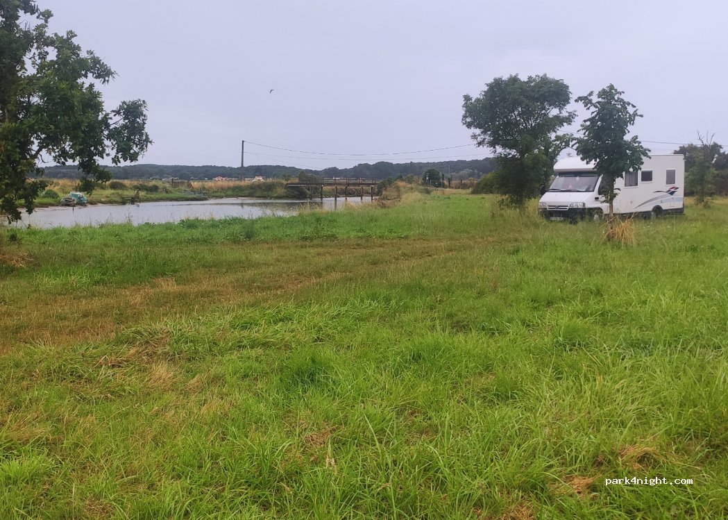 Parkeren op het grasveld van La Cabane, een bar-restaurant dat ook waterfietsen en kano's verhuurt. Mooie plek voor een picknick, geen schaduw. Onduidelijk of je hier ook kunt slapen.