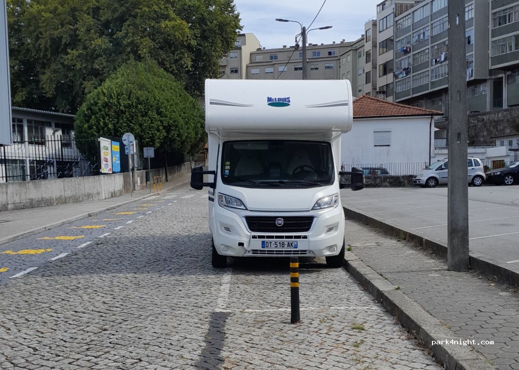 Stationnement limité à 4h, 2.60€ via l'application Telpark. Presque vide, nous avons pu garer nos 6m sans souci sur les longues places centrales. Probablement très sûr, deux postes de police non loin. Tout proche métro ligne D qui passe sur le Ponte Luis I.