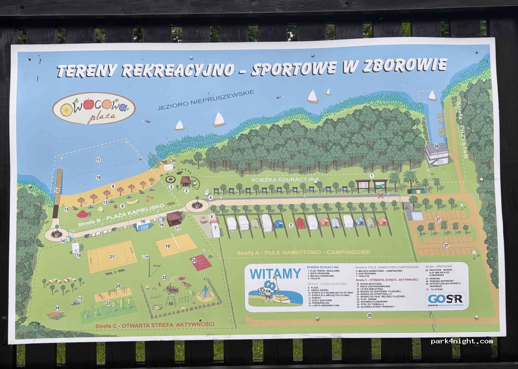 Ein großer Campingplatz, der von den örtlichen Behörden betrieben und verwaltet wird. Einige Orte haben Zugang zu Strom, aber nicht alle. Badezimmer und Duschen vorhanden. Spielplatz, Basketball- und Volleyballplätze, Sonnenschirme und ein Grillplatz. Im Sommer auch Verleih von Badeausrüstung und einige Imbisswagen. Bedingungen, Preise und Buchungsinformationen finden Sie auf der Website von GOSiR Dopiewo.
