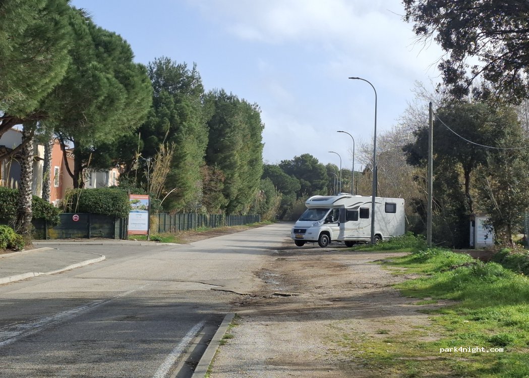 C'est un parking. En gravier le long de l'accès à la plage de la Badine. Nous y avons passé une bonne nuit en compagnie d'un fourgon. 150 m de la plage et du sentier du littoral.