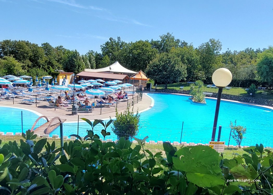 Camping pitches are not very big, but for 6m cars possible to park. Some places are bigger but costs 5€ ex Pool is ok, chairs and umbrella included But access only with bathing cap (italian spleen) buyable for 1.50€ each. Bathrooms are new, modern and clean. Free Wifi and electricity included of standard price (32€ for 2 adultes and camper is upper range) ACSI camping-car starts at 26.08. But we haven't