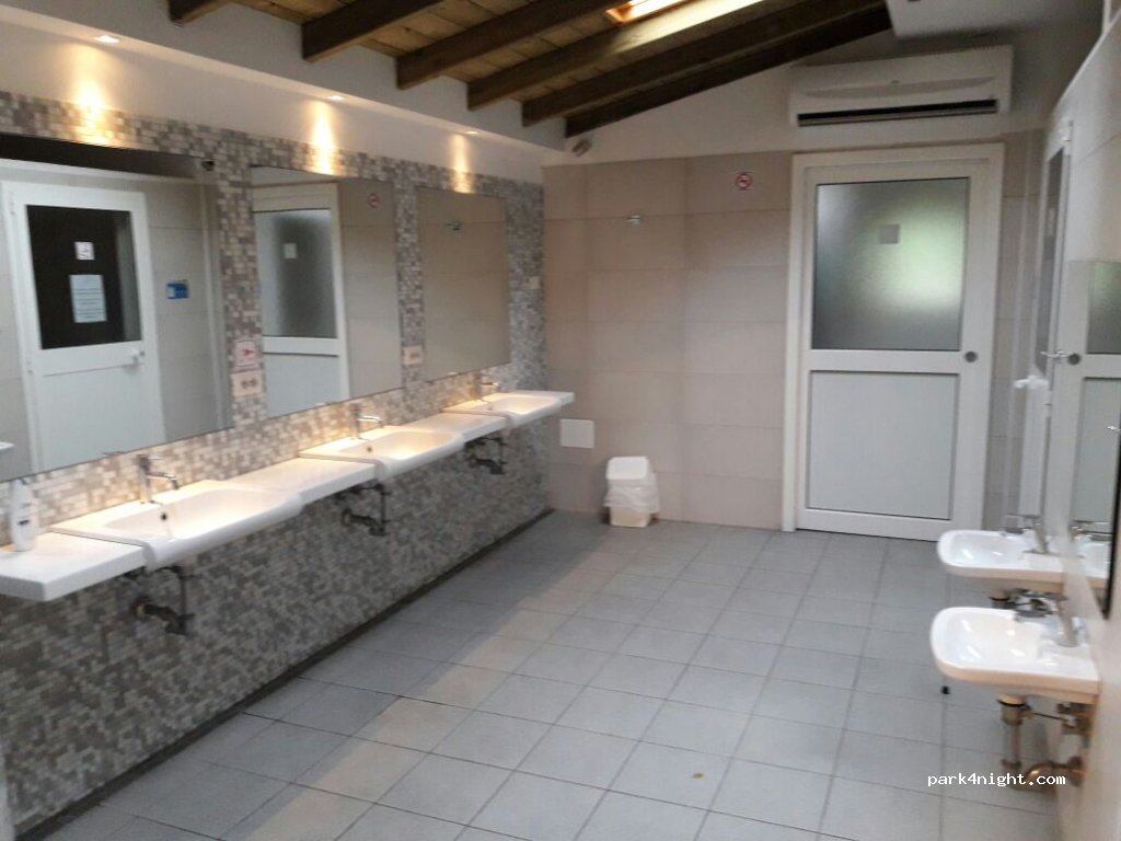 Agree with the other comments. Showers super clean and perfect hot water. Toilets have western seats and paper. Dish washing stations have very hot water that does not run out. Great restaurant that will be closed for vacation from 7 Dec until January. Nice staff that speak English. Bus stop is very easy and only €2 per person round trip. Best campground we experienced in Italy. €20 with ACSI.