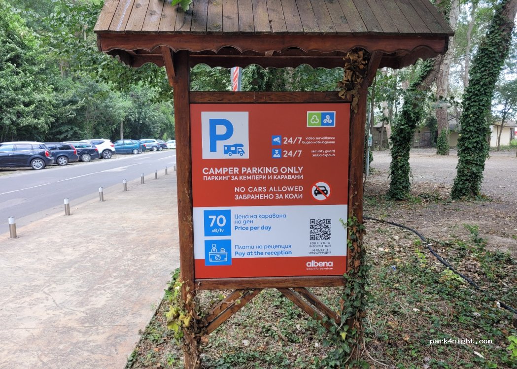 Um nach Albena hinein zu fahren, muss man Schranken passieren. Die "blaue Zone" erlaubt den Zugang zur Stadt und kostet 10 Leva / 24 Stunden. Um aber zum Campingplatz zu gelangen, muss man eine weitere Schranke passieren. In der "grünen Zone" kostet es 30 Leva / 24 Stunden. Diese Kosten muss man zu den Campingplatzgebühren dazu rechnen.