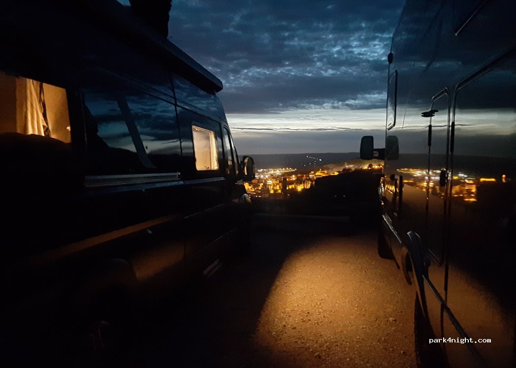 Sitio idóneo en plena naturaleza con vistas maravillosas de la ciudad. Lastima que coincidimos con varios grupos de caravanas/camper con música, corrillos a la 01 de la mañana y más, tenía pinta de ser algo normal.Finalmente dormimos a un margen de la carretera sin problemas.