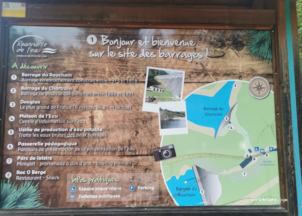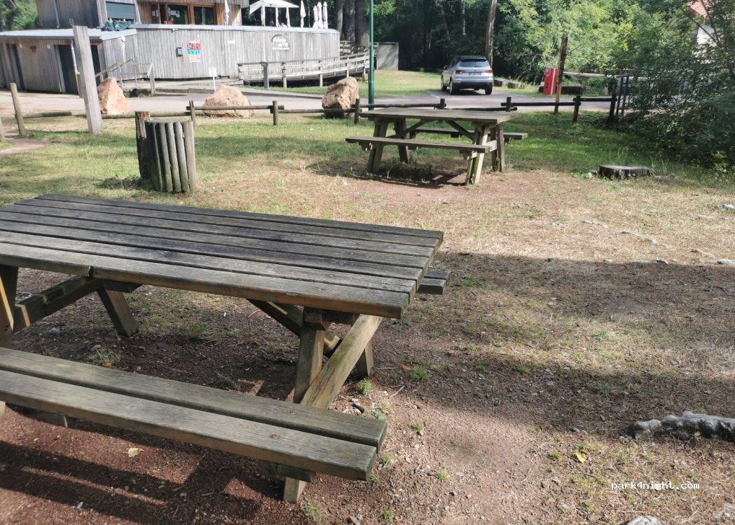 Places de stationnement à côté d'un restaurant, barrages, aire de jeux, table de pique nique.
