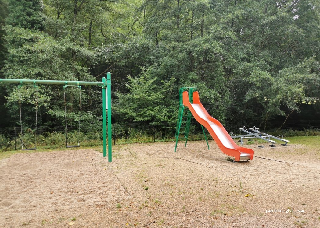 Plazas de aparcamiento junto a restaurante, presas, parque infantil, mesa de picnic.