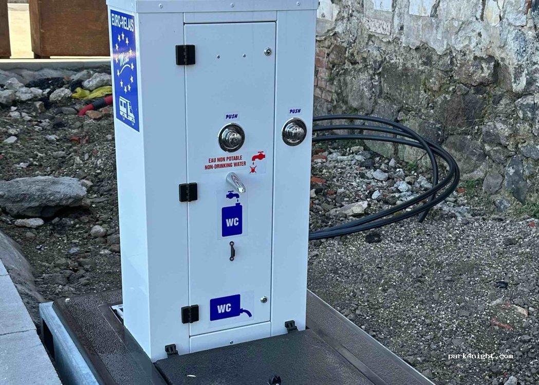 Point de service MH sur le parking. Eau potable et évacuation des eaux grises et noires. Ce service est inclus dans le prix du stationnement.