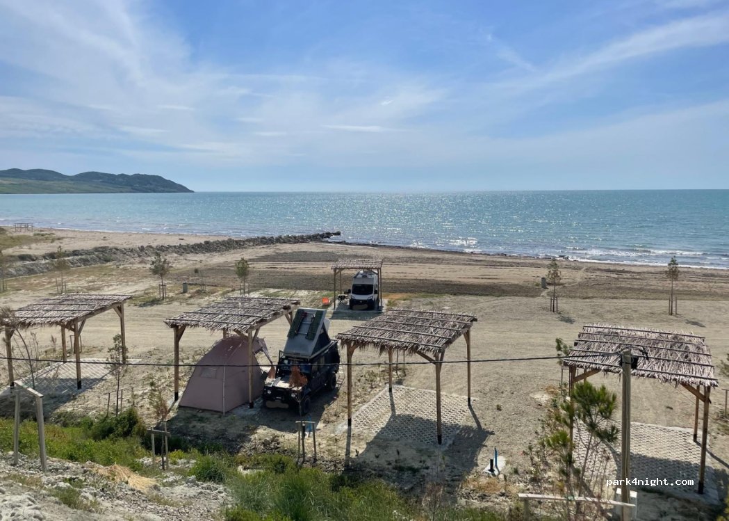 Beau spot pour dormir avec le bruit des vagues. Les sanitaires sont superbes. Les emplacements sous les cahutes sont bien équipés pour être à plat et avec eau et électricité. Le restaurant est bon. Le prix est un peu à la tête du client 39€ par nuit pour un van deux adultes et deux enfants ça fait très cher pour l’Albanie. Le site ne vaut pas le prix d’autant que la plage est sale.