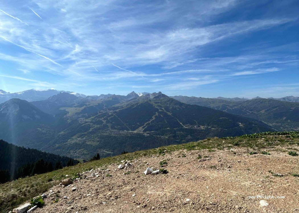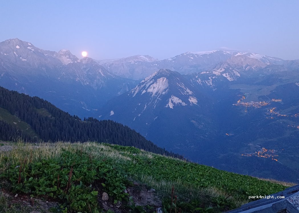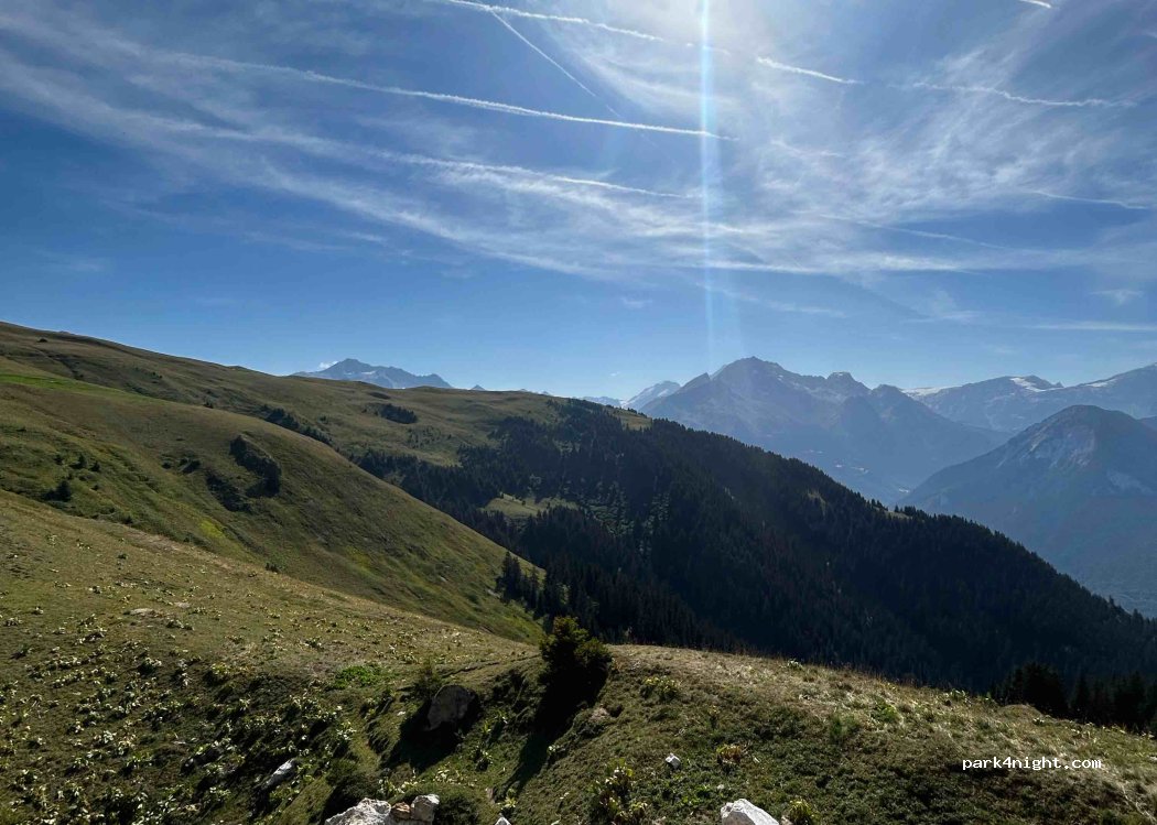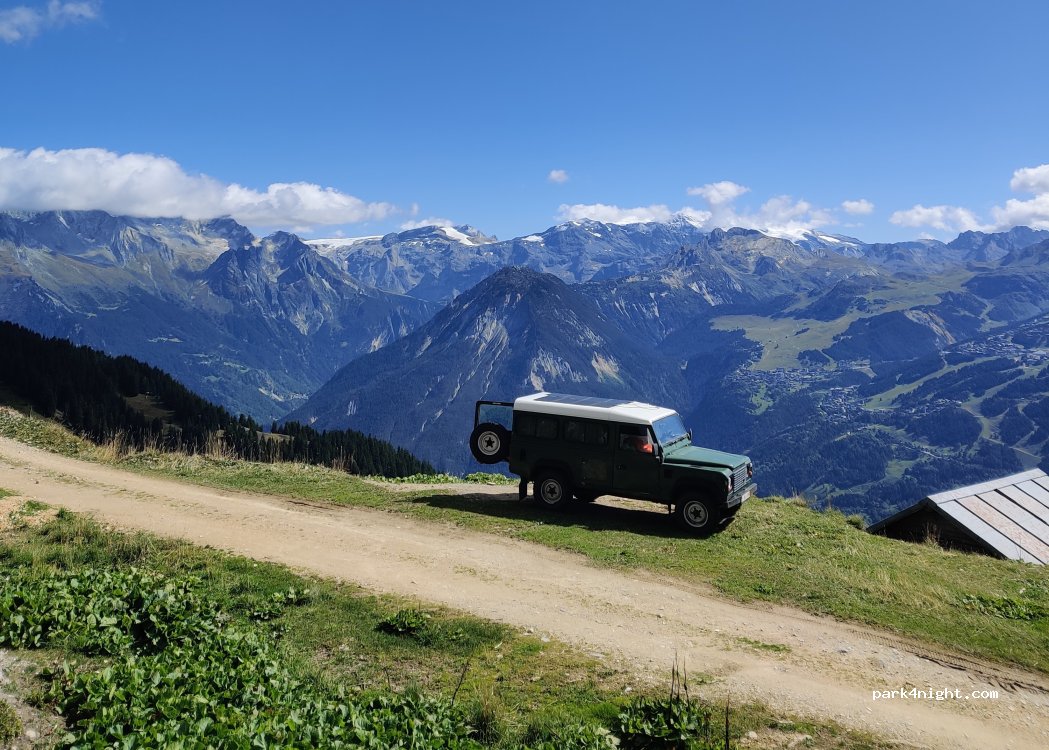 Amazing spot, great view of the Courchevel ski resort and other peaks. Stayed here 2 nights. Did not go down to the platform below as rain was expected, but just fine on the side of the track. Some farmers and other cars passed (5 across the day) and some MTBers, but they took no issue. Rocky and bumpy coming from Montagny, coming from Tincave is chiller (maybe even possible with van...)