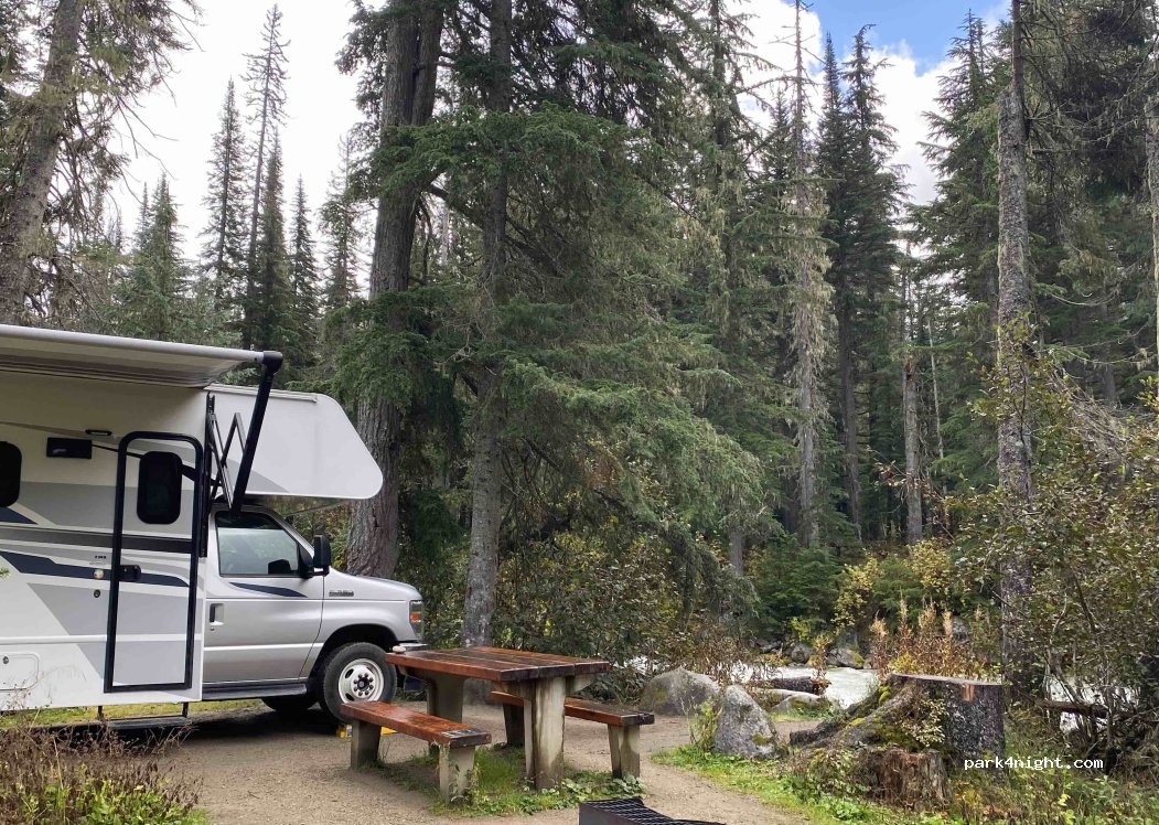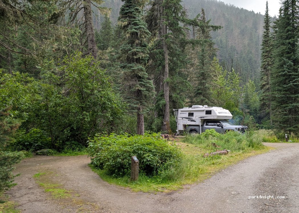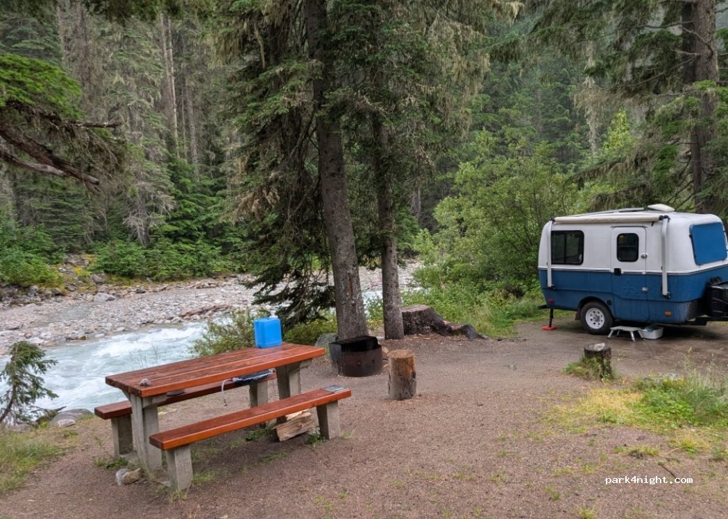 Illecillewaet Campground in Glacier National Park. Toilets and running water but no shower. Best option in the area as many trails start here.