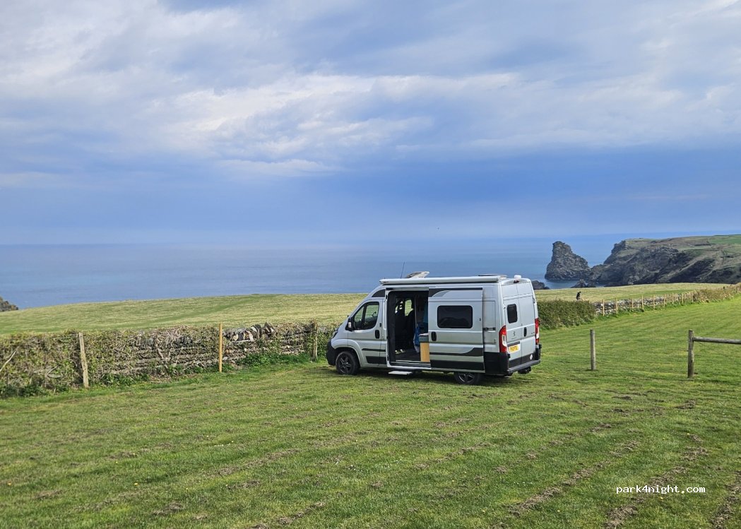 what an amazing spot and views, The grassed car park is locked at 7pm for motorhome use and makes it a secure park up. £1 parking all day and a bargain £5 for a safe overnight park up . on a slight slope, so would benefit from ramps. Tintagel village is lovely and has bars and restaurants only 1/2 mile away. park is right on the coastal walk.