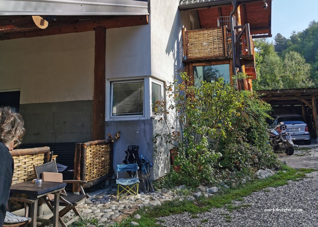 Kleiner Platz im Hof. Hätte noch einen Platz bekommen. Da Zlatiste-Camp voll. Einfahrt zu steil für Kastenwagen 6m (aufgesetzt mit Auspuff und Treppe), sah auch schon sehr zerkratzt aus. Kleine Fahrzeuge denke kein Problem.
