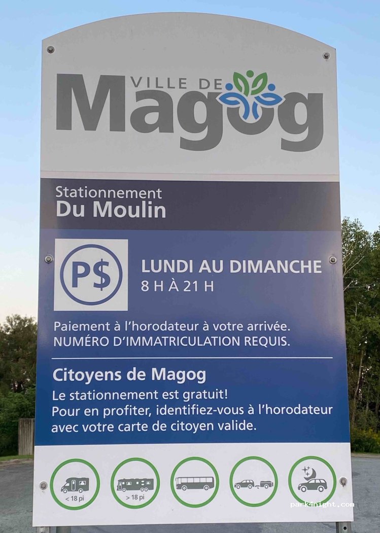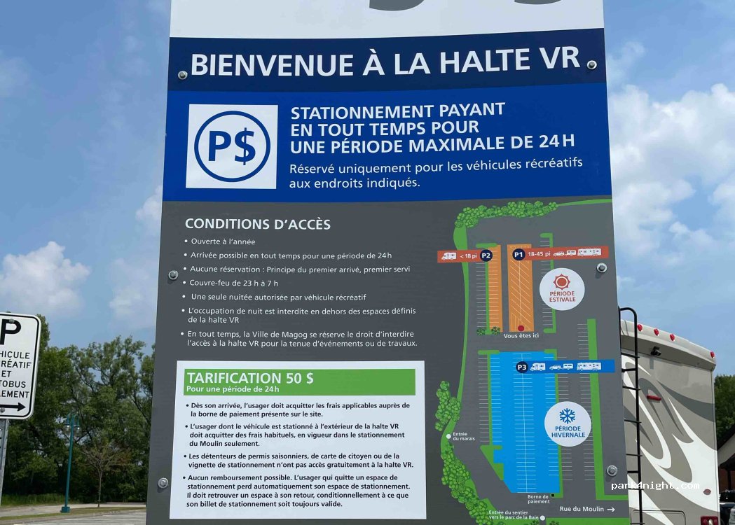 Grand stationnement tout près de plage, piste cyclable, sentiers pédestres, centre-ville de Magog. Gratuit de 21 hres à 8 am. Après 8 hres 20$ / jour ou 5$ / heure. Très tranquille et propre . Beaucoup d’espace Nous étions 4 vr dont 2 classe A