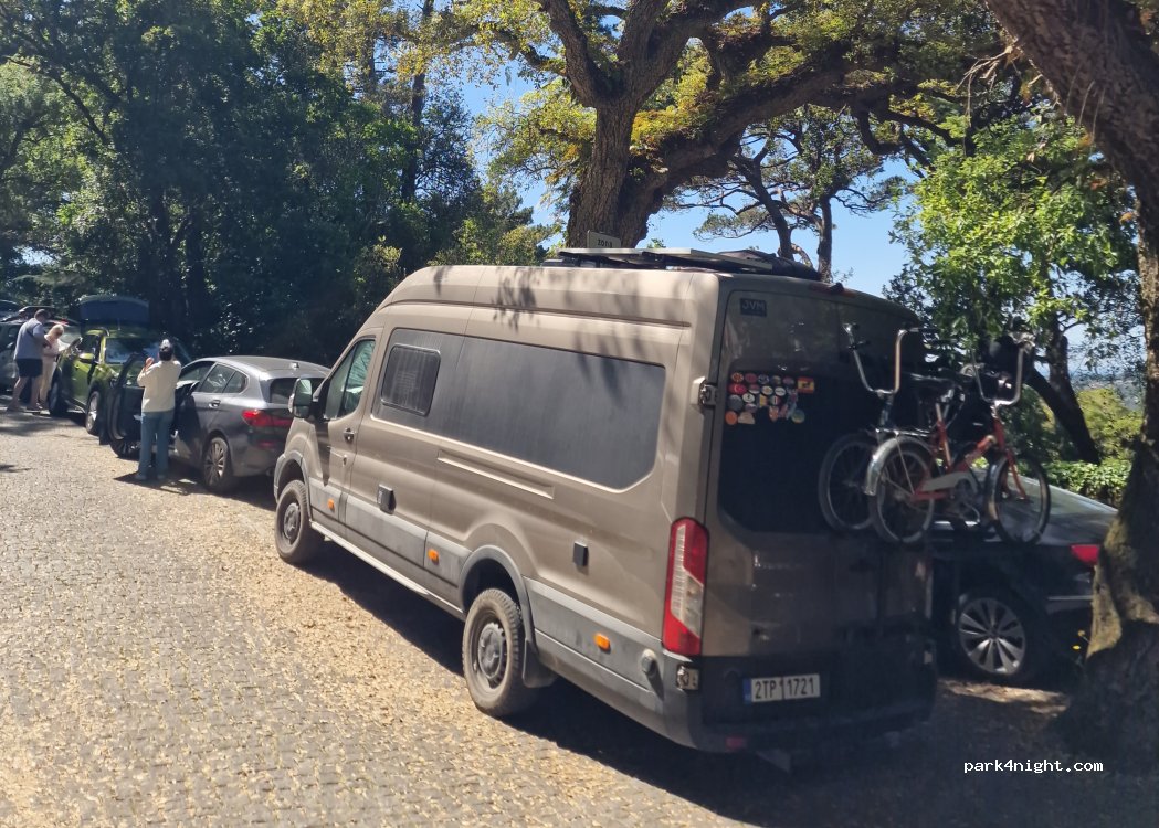 À éviter, l'accès par la ville de Sintra est un véritable enfer. Rues très étroites et bondées de touristes. Interdit aux véhicules de plus de 11 m mais même en Twingo je n'y mettrai plus jamais les pieds. De plus interdiction de stationner la nuit sur ce parking (sans panneaux interdisant) l'armée (oui l'armée en personne) est venue nous déloger à 23h pour nous escorter (une fois de plus dans les rues étroites et pleines de touristes bourrés cette fois) jusqu'à l'aire de camping-cars payants à côté de Sintra qui étant elle aussi pleine nous avons filé vers le sud... Très mauvais souvenir, à éviter