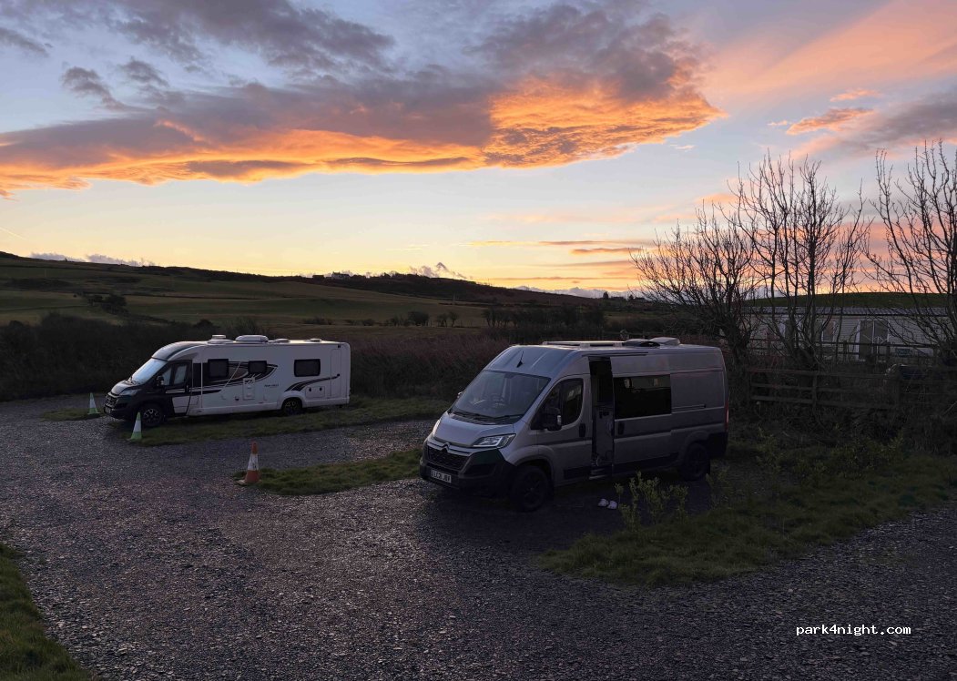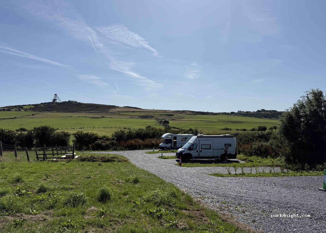 Motorhome Aire. Adults only, dogs must be kept on a lead. Five level hard standing pitches, peaceful semi rural location, great access for larger motorhomes. Close to Parys Mountain. Convenient stopover if using Holyhead Ferry Port. Fabulous sea and countryside views, amazing sunsets. Chemical toilet disposal point, grey waste disposal point, fresh water. Call to reserve a space or just turn up.