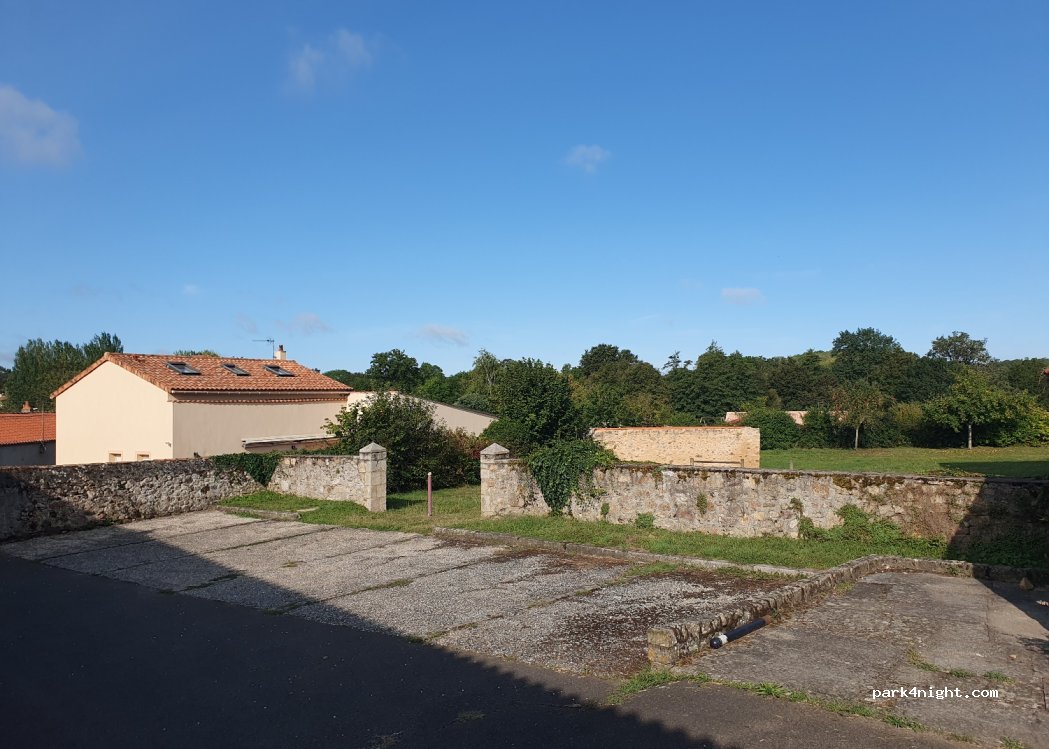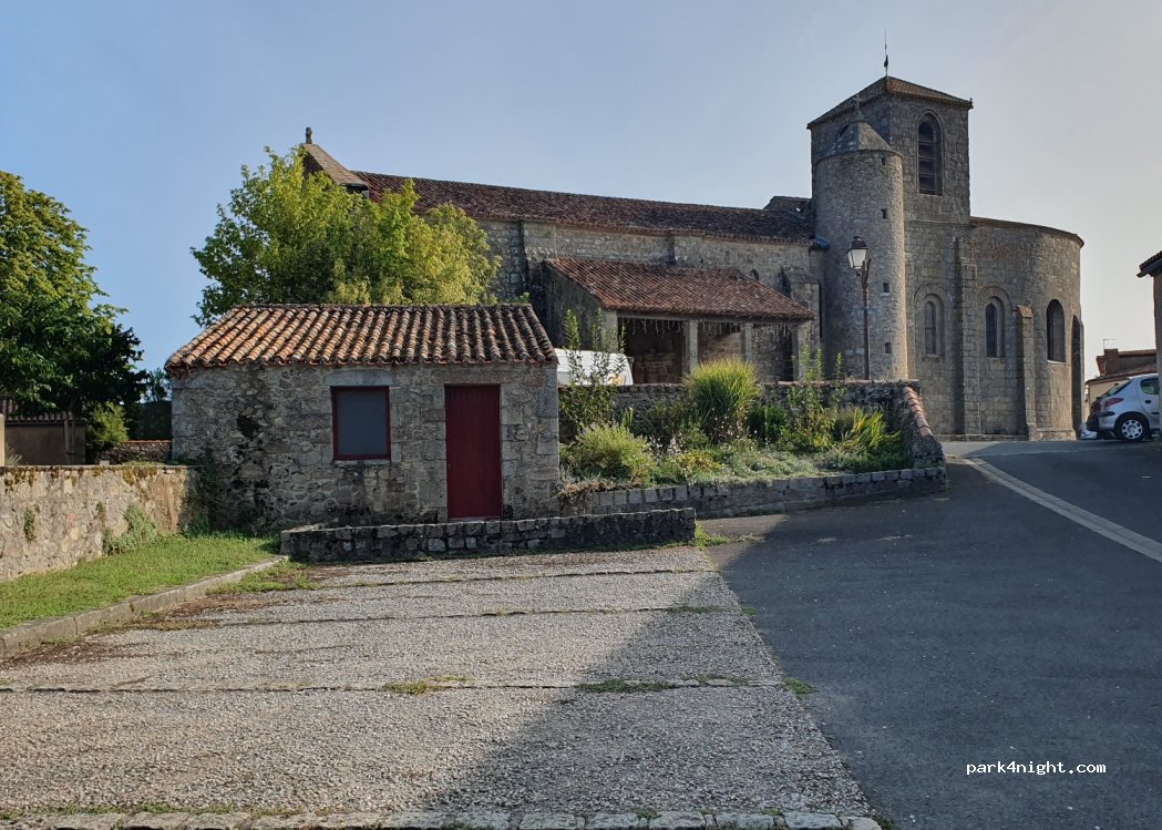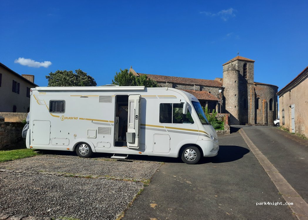 Quiet parking in the heart of a small village, ideal for a picnic, but also suitable for a night, the ground is flat. Suitable for vans and vans up to 6m. Only noise: the bells strike the hours from 7am. 10m below the church car park. Beautiful little Romanesque church to visit, view of a small orchard. Bakery 5 minutes walk away, and toilets halfway to the bakery.