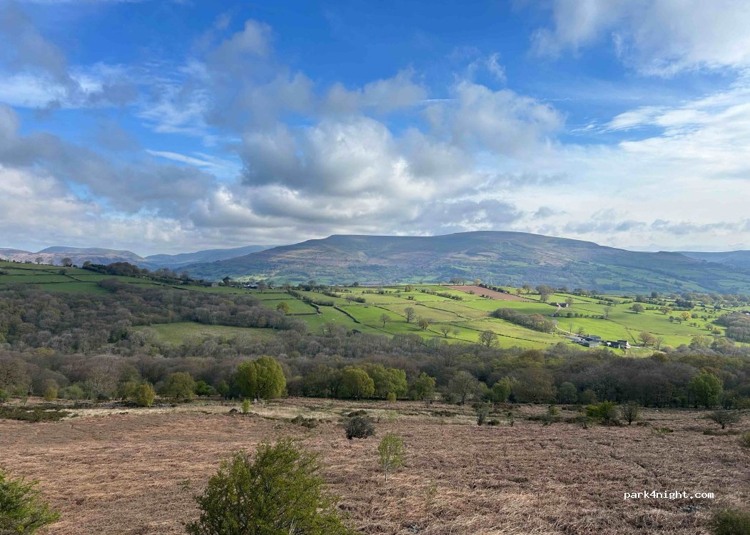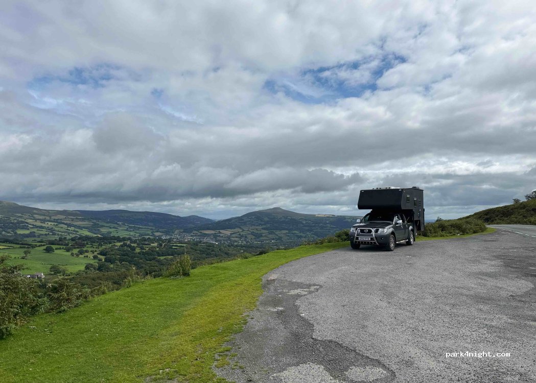Small layby on good B road. Tremendous view over Llangattock to Sugar Loaf and the North. Fairly level. Generally quieter road. Nothing in the night just started about 6am. Shared with 2 others on Good Friday night. Great walk along Craig y Cilau nature reserve. No litter at all.