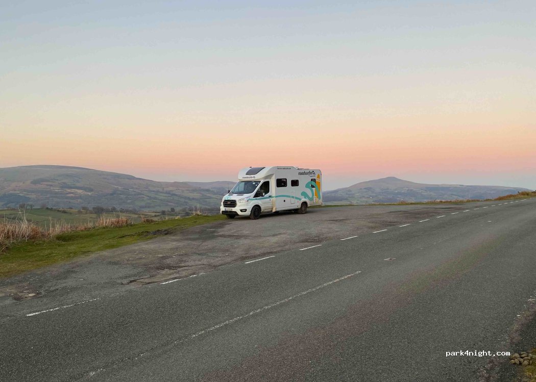 Incredible views! A nice wide/deep lay by so you can reverse up and enjoy the views. Hardly any cars passing after 8pm, and didn’t hear a single one after 10pm. Felt very safe.