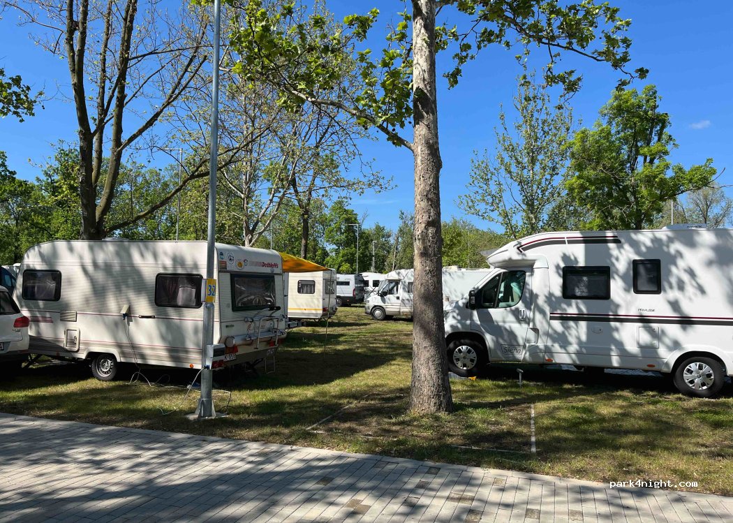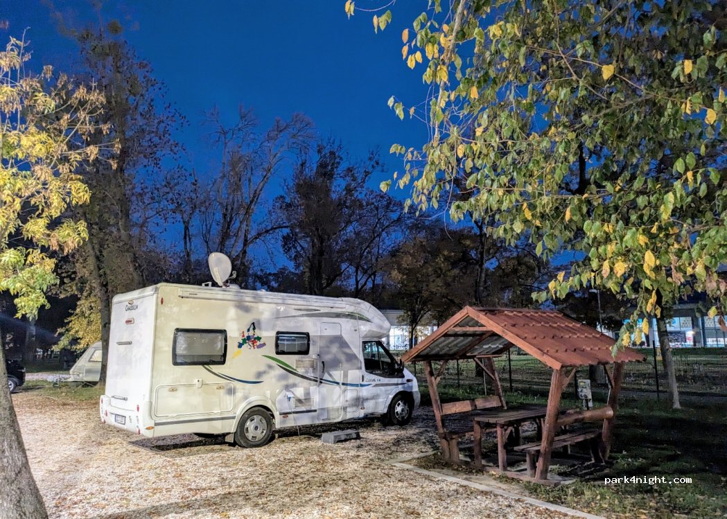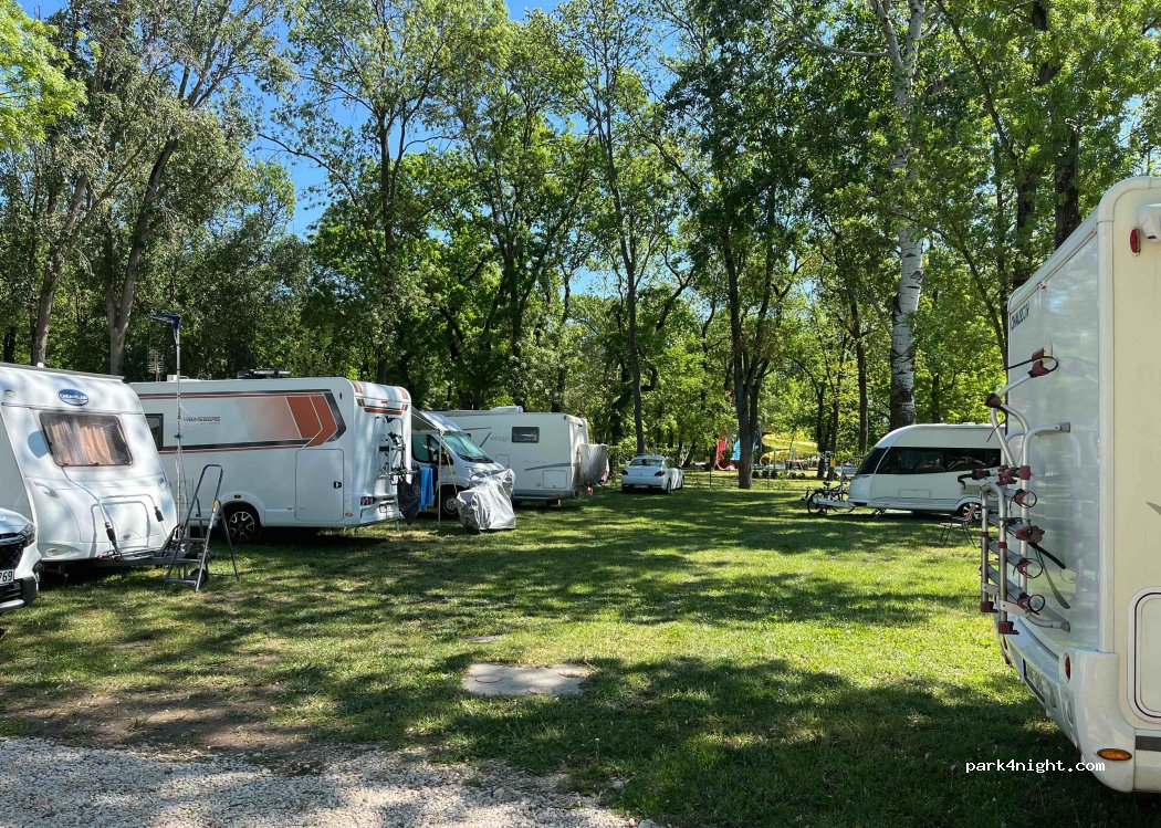 Excellent place, very clean, easy to reach from the street, all services, three outdoor pools, two warm, and one Olympic. Large spaces and walking distance from the supermarket and other shops. There is a large playground next to it with games for children. In season there are also water slides. About 28 euros per night for parking and two adults including free entry to the thermal pools.