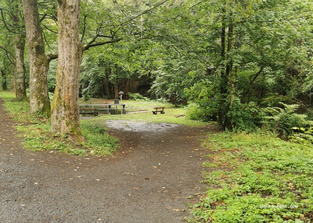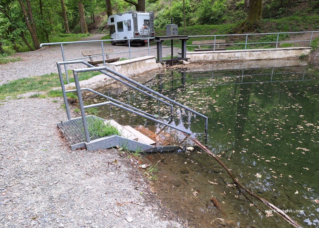 Een unieke plek voor 1 camper. Direct aan een openbare zwemvijver met meerdere bankjes. De plaats is schaduwrijk en behoorlijk vlak. vanuit deze plek kun je direct het bos in om te wandelen of te mountainbiken. Er staan 2 prullenbakken maar wij hebben ons afval gewoon meegenomen. Het was erg schoon.