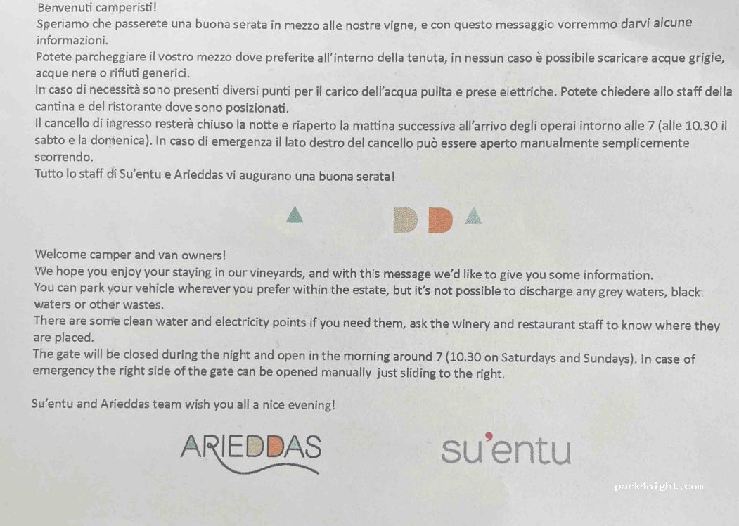 La tenuta Su'entu accoglie i campeggiatori per la notte in mezzo al vigneto, orari di apertura e informazioni aggiornate sul sito. Possibilità di visitare la cantina e fare degustazioni. Il cancello viene chiuso la sera e riaperto al mattino presto (chiedere al personale tutte le informazioni su ingresso/uscita e orari). Tutta l'area è recintata e protetta. Il ristorante dell'azienda si chiama Arieddas ed è aperto a pranzo e cena.