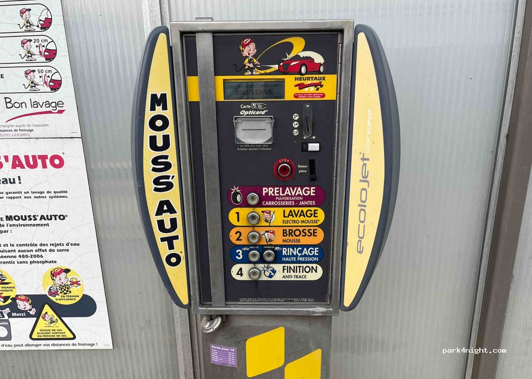 Station de lavage sous pression avec portique pour permettre l'accès au toit du véhicule.