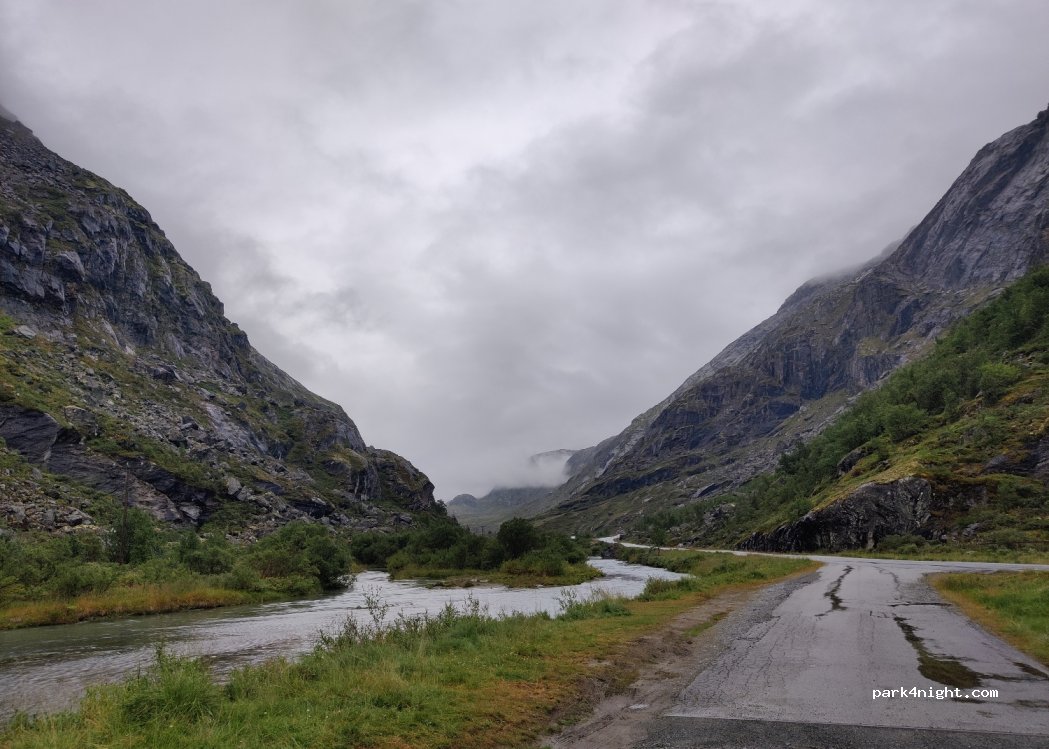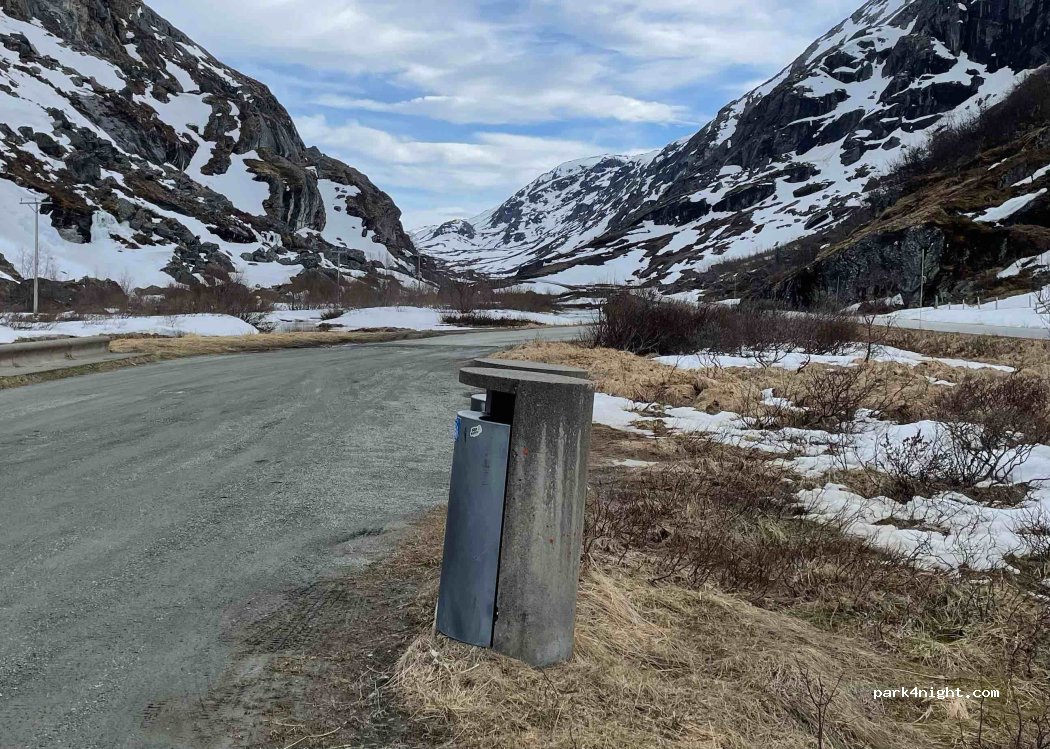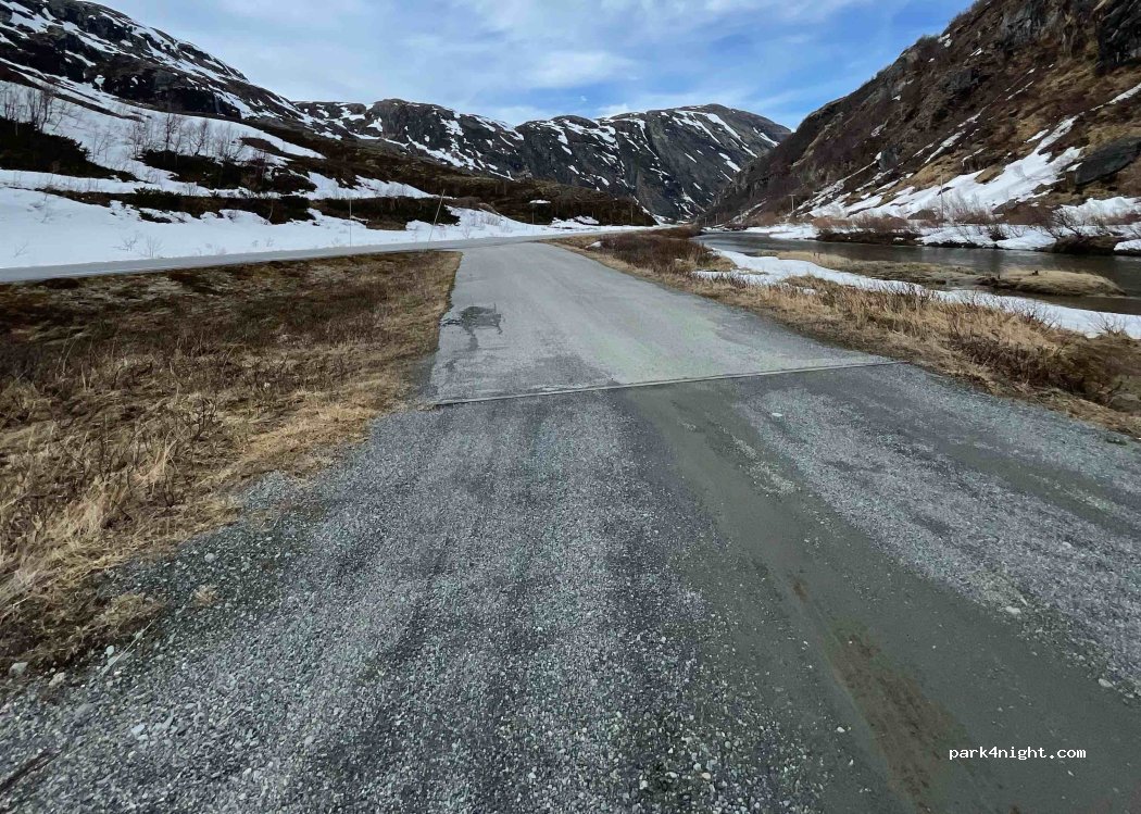 This is a fairly big gravel parking lot next to the rapids. Nice views of the surrounding mountains, and close proximity to the caves of Dumdalen. The area is fairly open and there aren't much foliagage around, so you're unfortuneatly quite exposed in terms of visibility. There is no service.