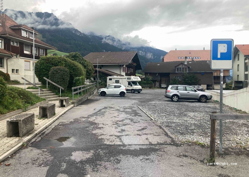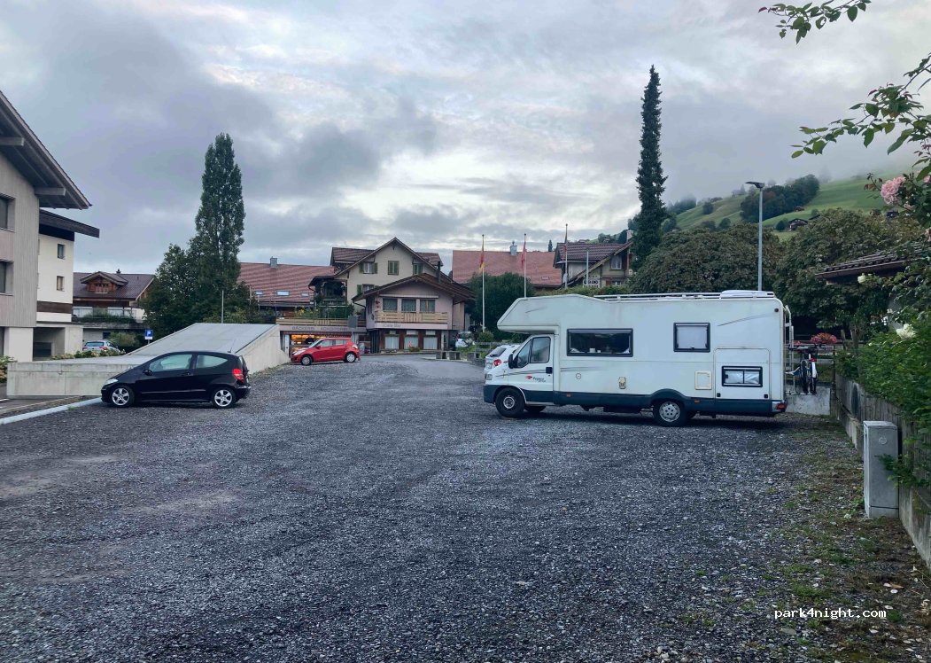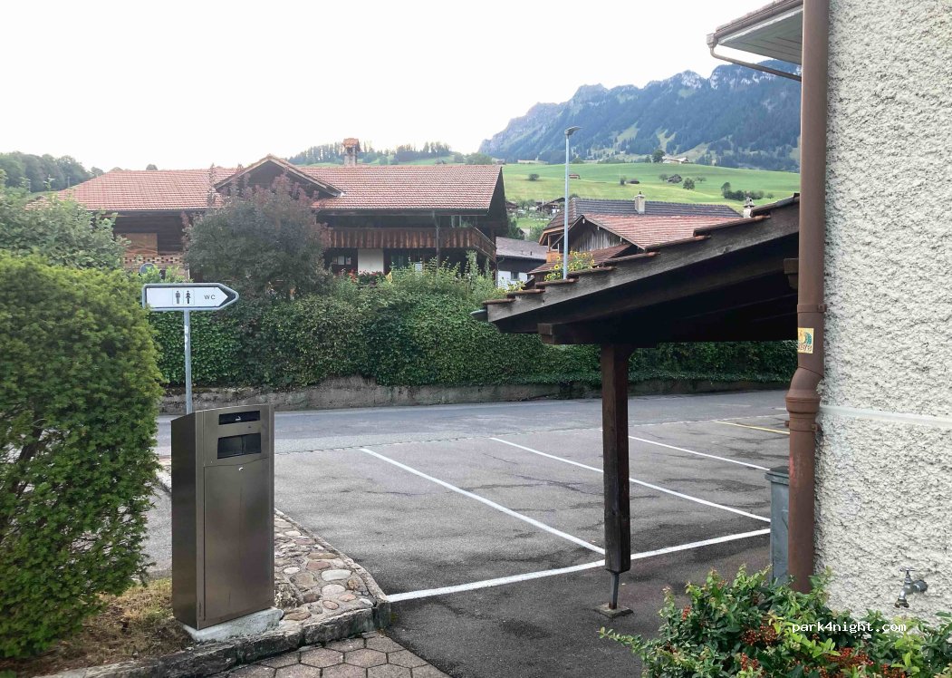Arrivée à 19h, parking avec plusieurs places. Une nuit très calme dans un petit village Suisse charmant à voir. Belle vu sur lac et montagne, passerelle himalayenne non loin. Les toilettes sont très propre, les commerces à quelques mètres. Une belle surprise.
