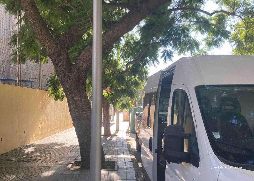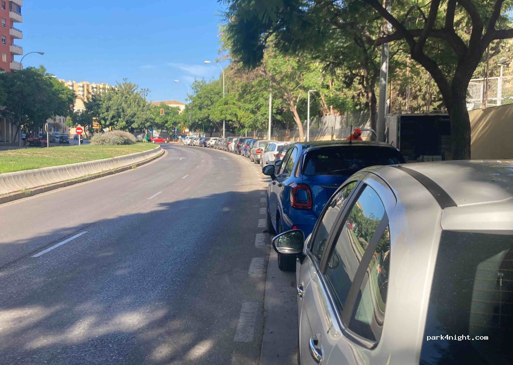 NON-paid parking with white lines, wide sidewalk, trees that provide shade and cool all day. Street with little traffic at night. 8 minutes walk from the center, Picasso Garden 5 minutes walk.