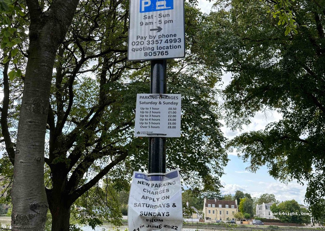 Stayed here on a Weds night. Parked further down the lane opposite entrance to Golf and Tennis club - free parking except weekend daytimes - you have to pay via a phone number. Very quiet - a few runners, dog walkers and rowers on the river. Very flat for parking. 25 mins walk to Kew Gardens tube station. Would stay here again.