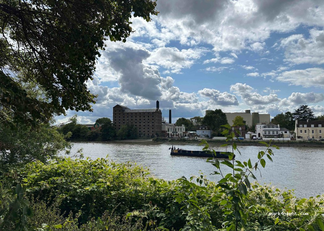 Duke’s Meadows, riverside parking. View of Thames, Budweiser brewery and Chiswick Bridge.