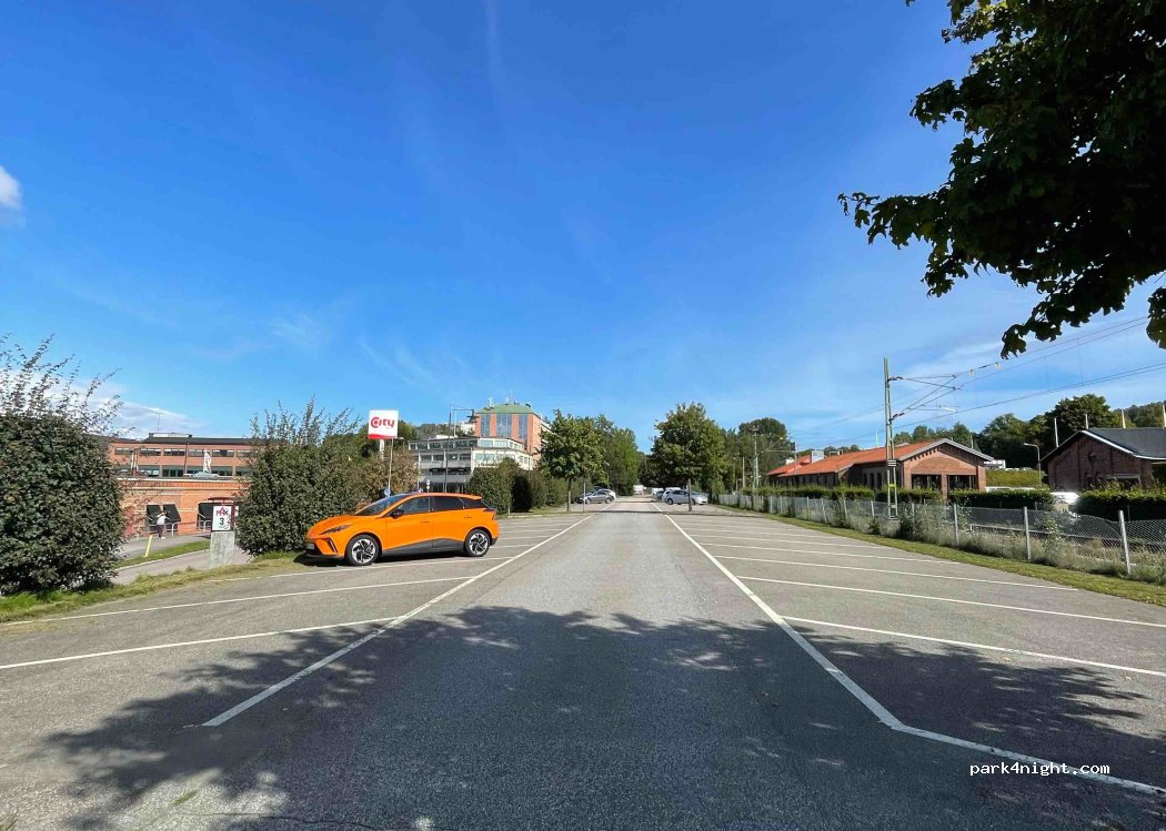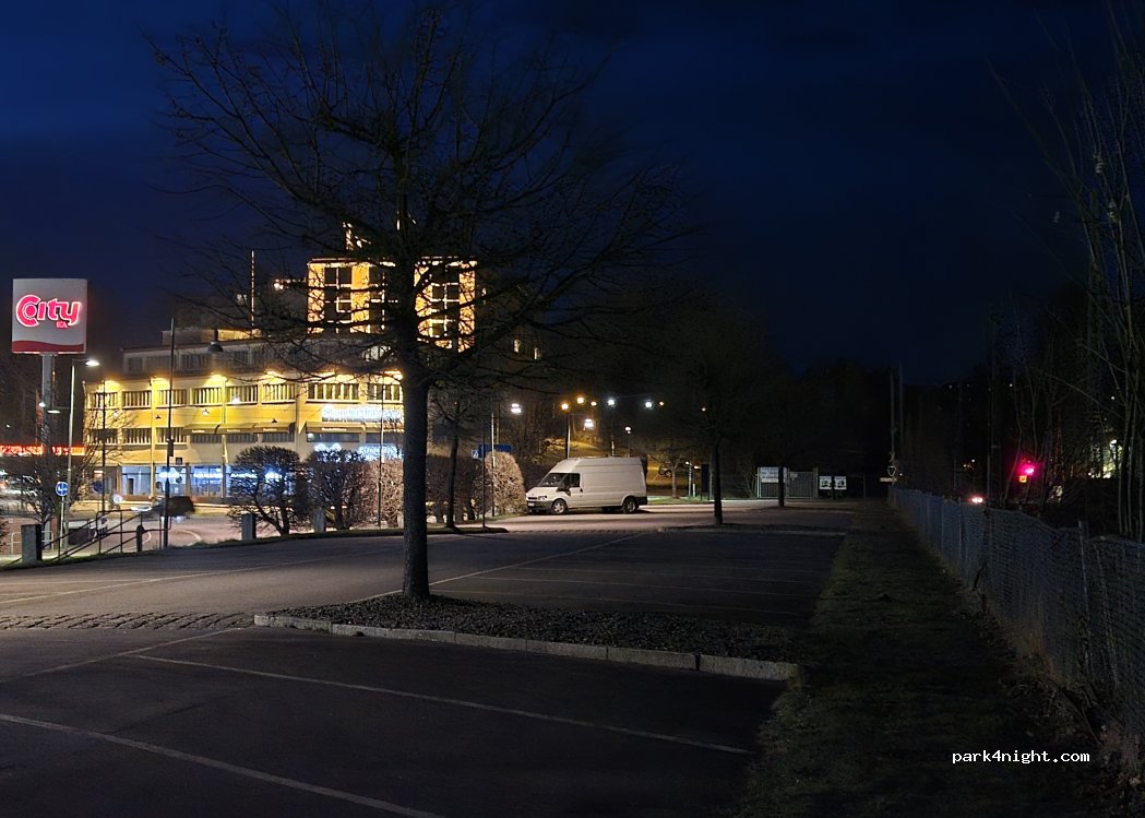 Parking space that is suitable for smaller motorhomes up to 7-8m. Slanted with some space at the back. There is a charge until 6 p.m. No prohibition signs, theoretically allowed at night. Front street. Rear train. Good for a trip into the city. Supermarket with toilets next door.