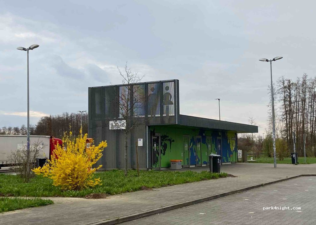 Guter Rastplatz an der Autobahn für eine Nacht auf der Durchreise. Ein von den LKWs abgetrennter Bereich sichert einem auch spät noch ein Plätzchen.