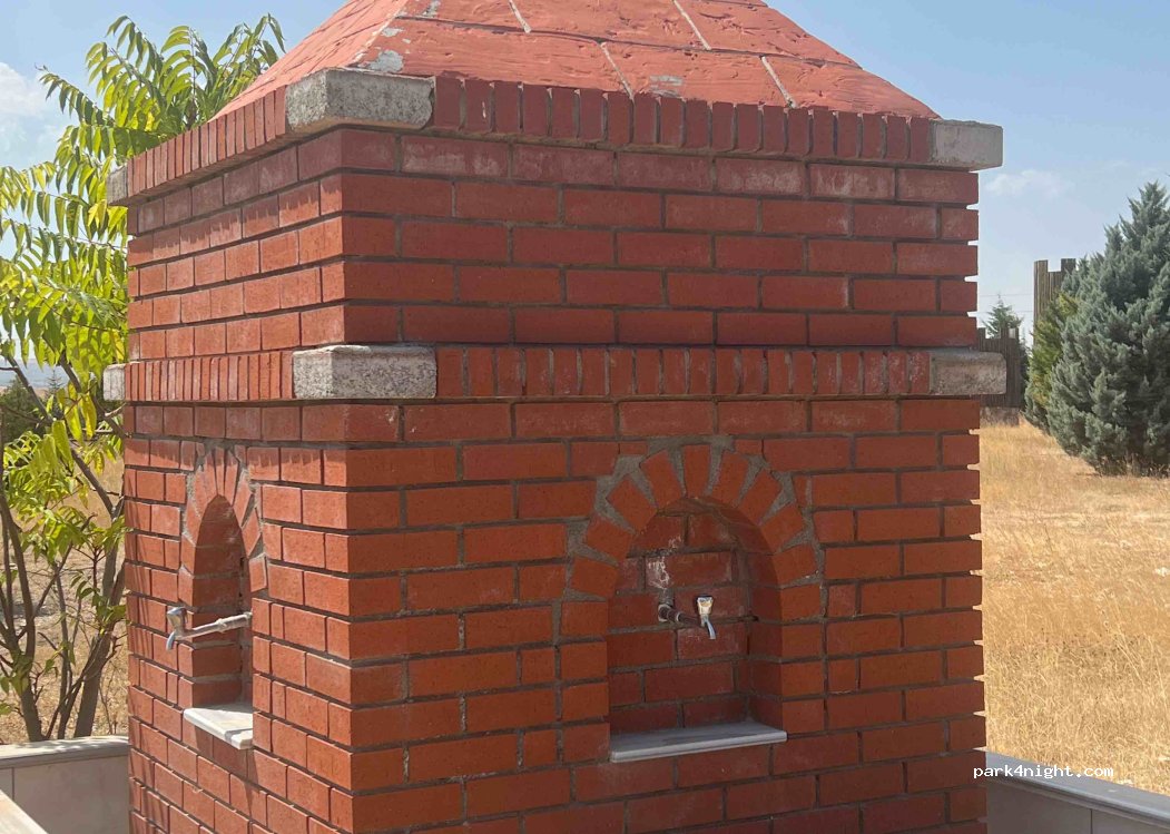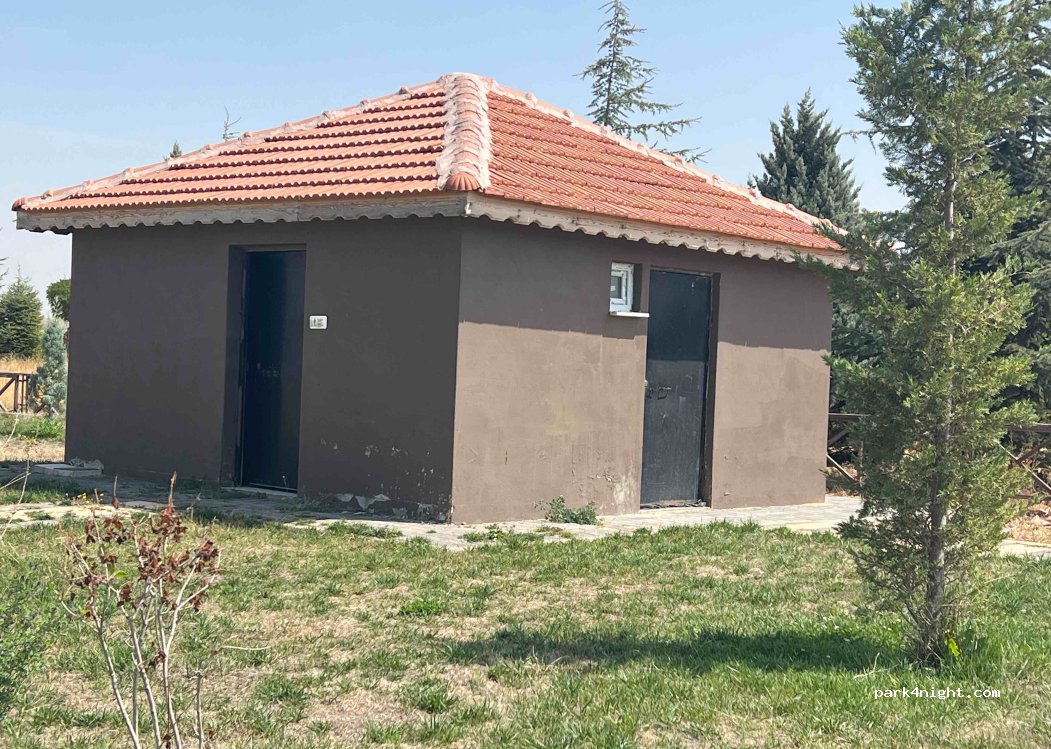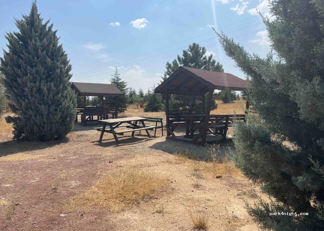 Picnic area with tables, benches and some stone barbecues. Toilets nearby and water fountains, trash cans. Quiet at night despite the road next to it