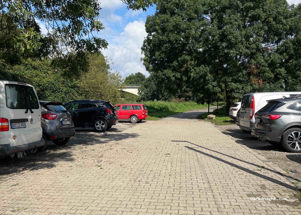 Der Parkplatz liegt am Ende einer Sackgasse und ist durch die angrenzende Hundewiese sehr frequentiert. Für Camper wird es eng. Nur für 5 m Länge geeignet, da es nur PKW-Stellplätze gibt.
