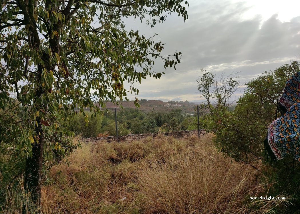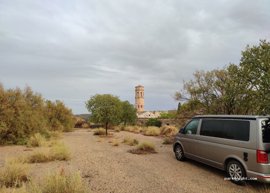 Parkplatz 2 des Klosters Rueda. Es handelt sich um ein unbefestigtes offenes Feld mit viel Platz.