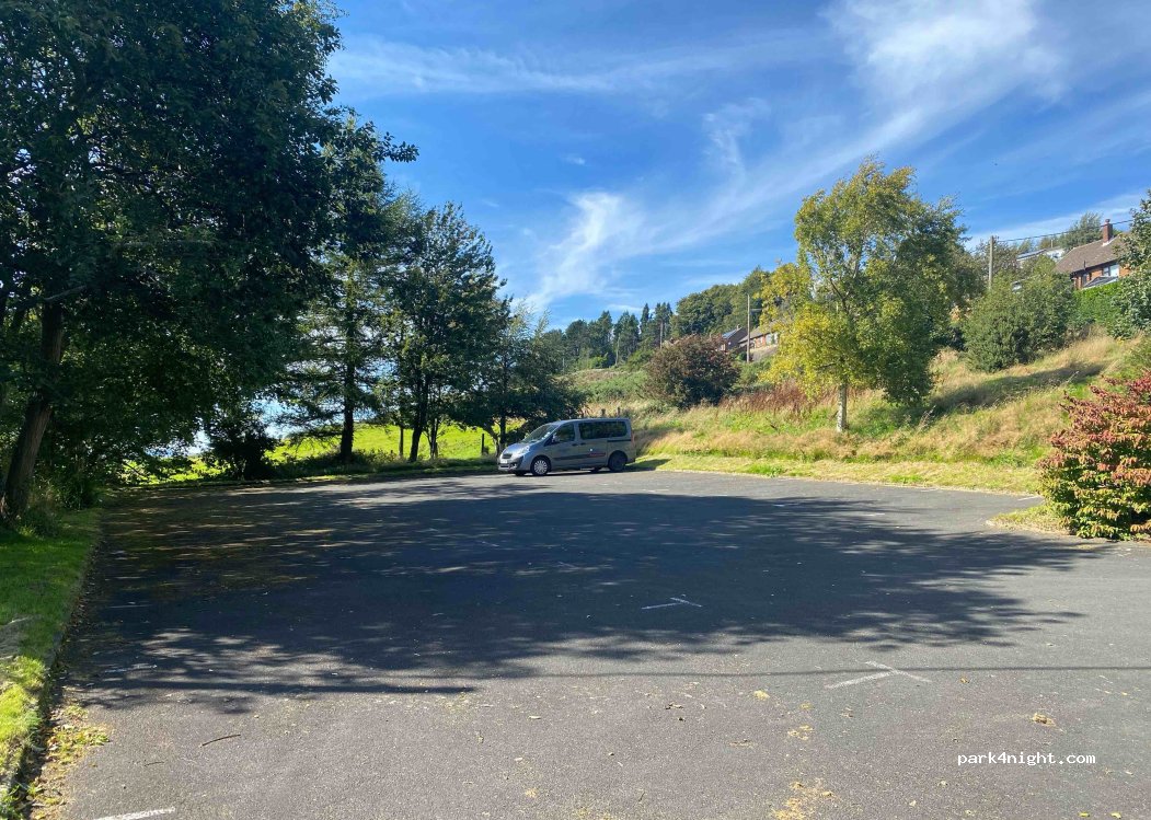 A small car park on the edge of the village next to a church. On a very slight slope overlooking the valley. Some shade from the sun under the trees. Overlooks a road which is fairly busy during the day. No facilities, take your rubbish away with you. No height limit.
