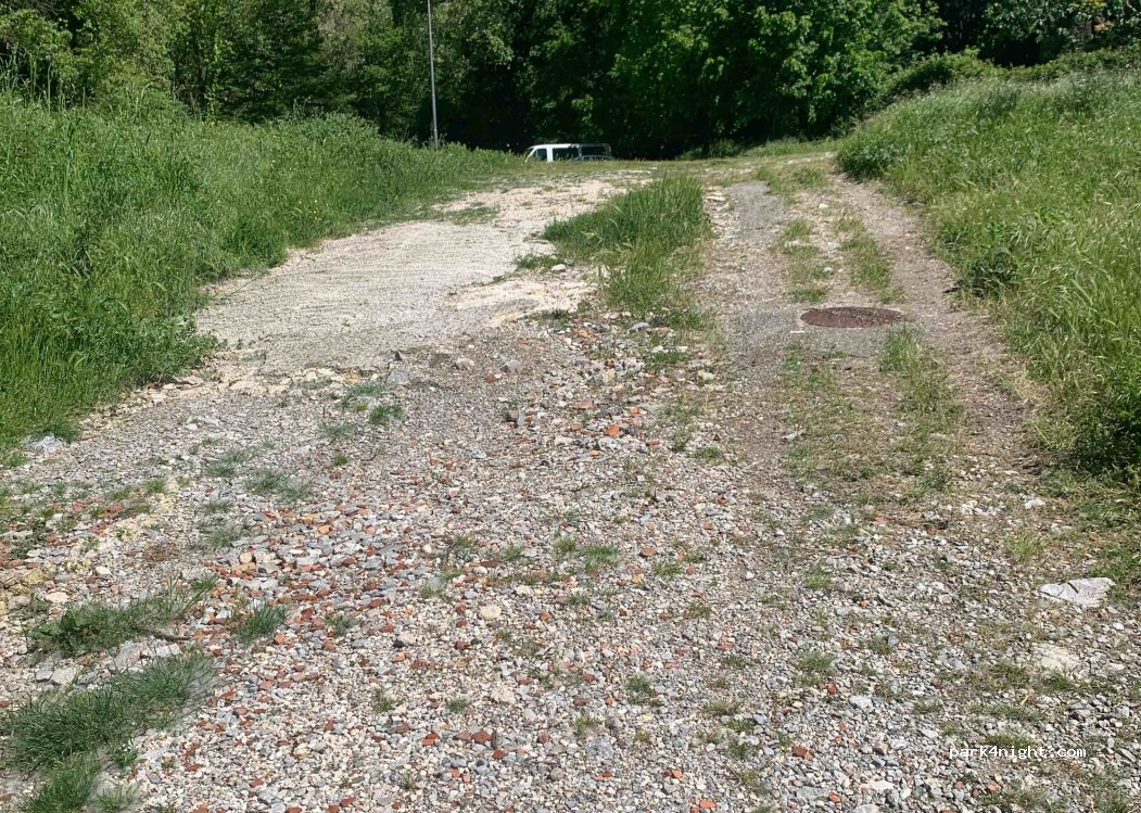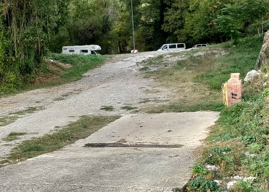 Narrow access with sharp curves. Not really tidy, but in Italy that's standard. Quiet at night. Public lights. Haven't found a toilet discharge sink. The village is interesting with an excessive number of fountains, worth a walk. There's a good restaurant and children's playground.