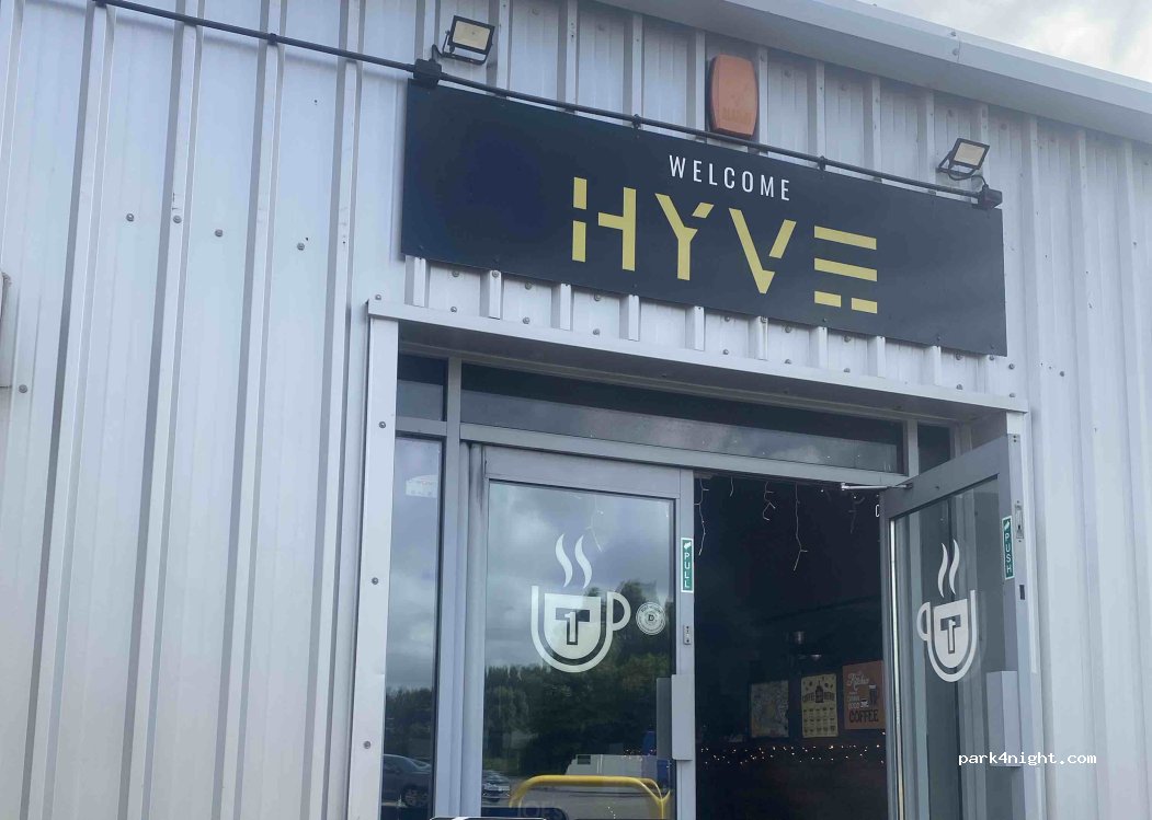 Super friendly greeting from Tre. Easy parking. Slight noise from road and unfortunately an early morning car park visitor with very loud music...shame! Use of lovely shower in the morning. Amazing café with the most fantastic cooked breakfast. Many thanks to Hyve Gym for providing this stop over.