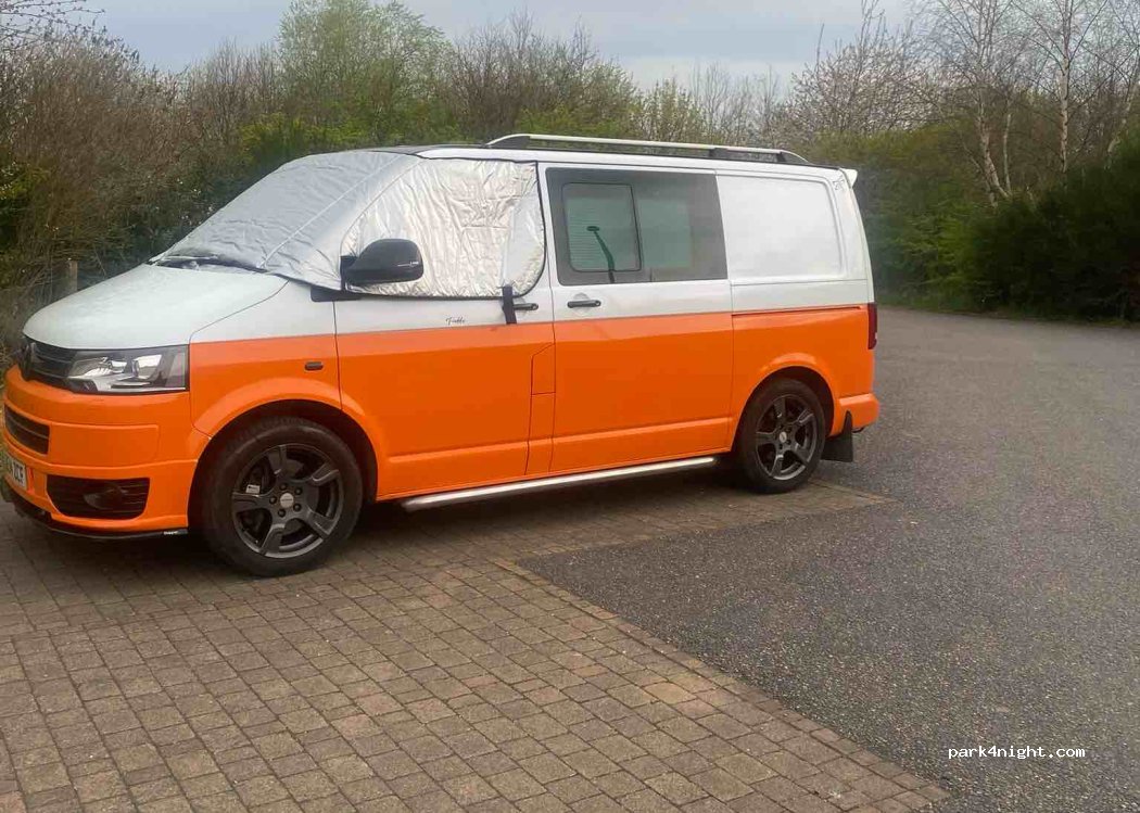 Endroit très calme pour dormir et un peu à l'écart de la route. Pas de beau paysage au réveil mais un calme qui fait du bien. Très bien placé juste à côté d'un Coop, Tesco, McDo. De la place pour plusieurs van.